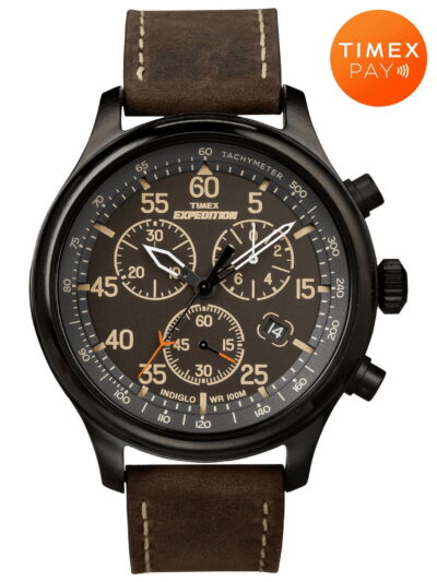 Timex Men’s Expedition Field Chrono 43mm Watch with Timex Pay Contactless Payment – Black Dial & Case Brown Leather Strap