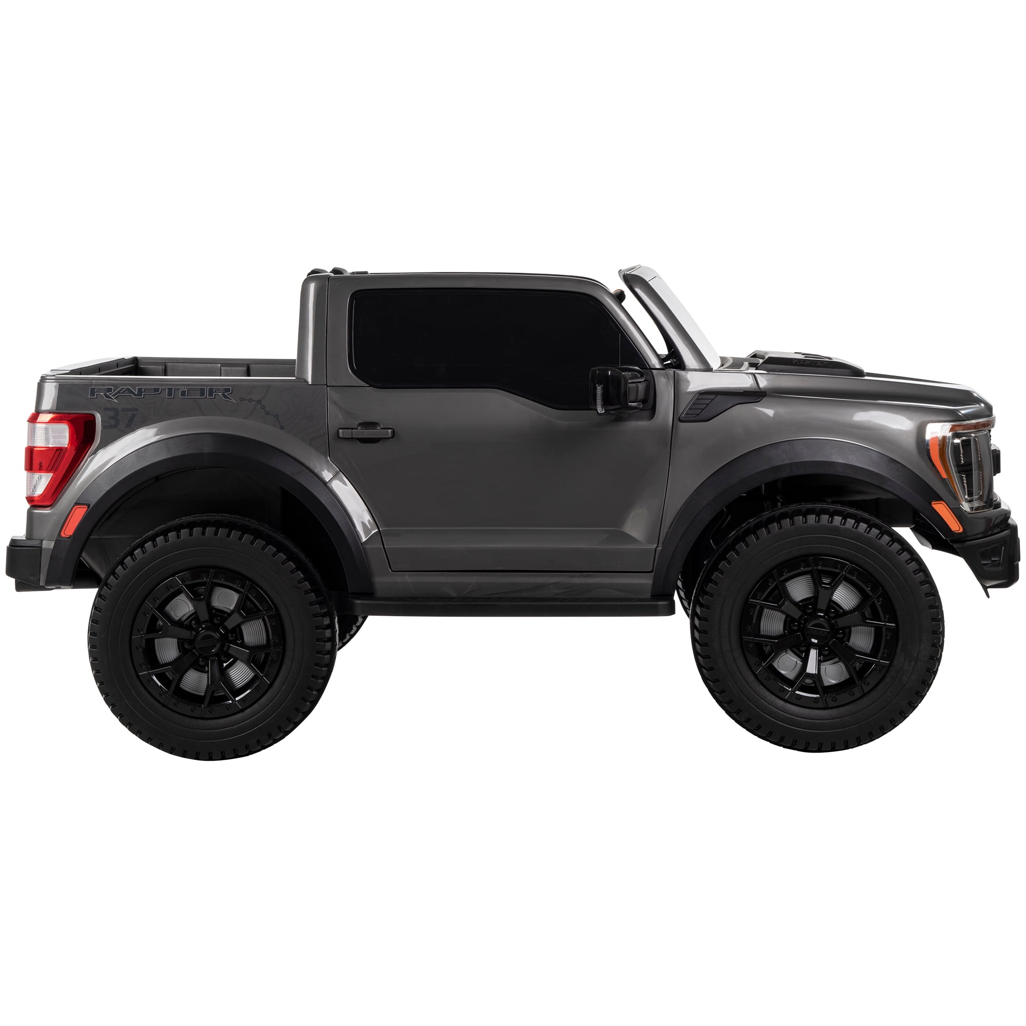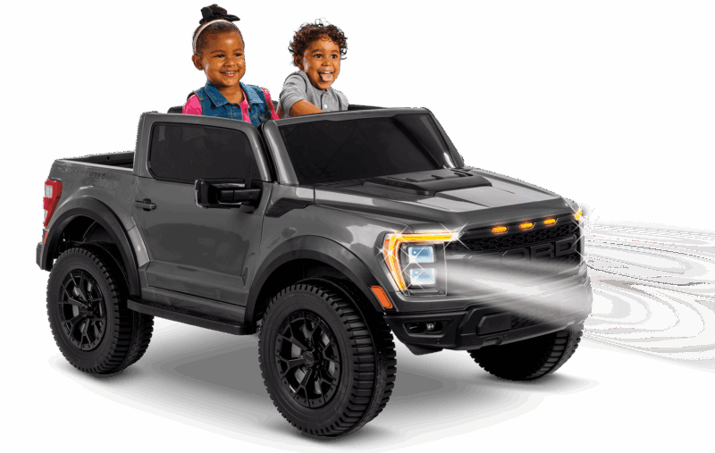 Truckloads of fun adventure is rolling your way! We’ve got the perfect ride-on for your truck-loving kid who has a need for speed! The grey Ford F-150 Raptor 12-volt battery ride-on is the perfect toy to provide your kid with loads of fun during playtime. This kids’ truck ride-on is decked out with realistic features from the working lights, doors and tailgate to the truck sounds that will make the neighbors think a real F-150 Raptor is on its way down the sidewalk! This ride-on toy has two speed settings, slow (2.5 mph) and fast (5 mph) and can drive forward or in reverse. To get rolling, your child will simply press the power button on the dash and press the foot accelerator. This ride-on can carry up to two children who weigh no more than a combined 125 lbs. If they need a GPS to get them to their pretend destination, the mount on the dash can hold their phone secure while they get directions, and they’ve also got a cupholder for their favorite drink! Many fun memories are waiting to be made in this Ford F-150 Raptor 12-volt truck ride-on toy!