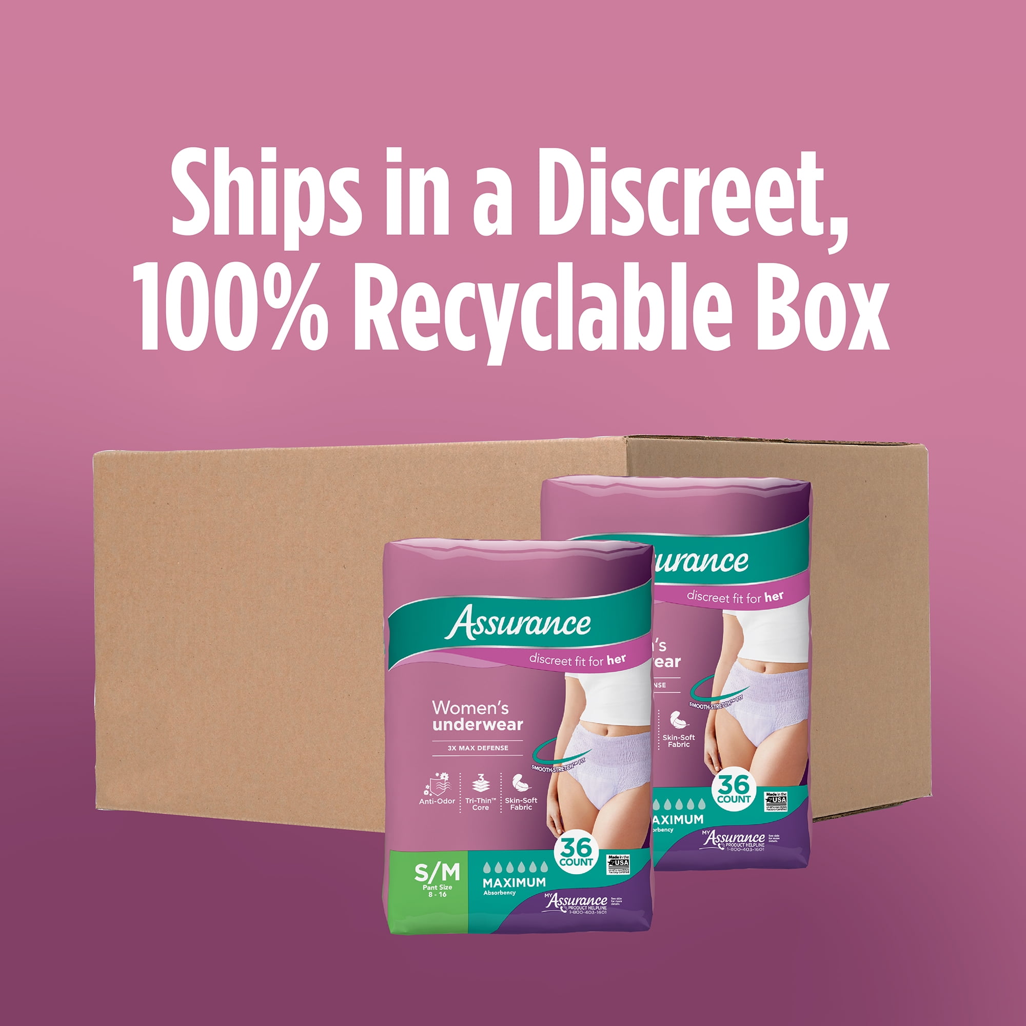 Assurance Incontinence & Postpartum Underwear for Women are designed with a unique Tri-Thin absorbent core and anti-odor feature helps keeps you feeling comfortable for up to 8 hours – that is a full work day! Made with you in mind, Assurance Underwear for Women helps you feel comfortable and dry while living your active, on-the-go lifestyle.