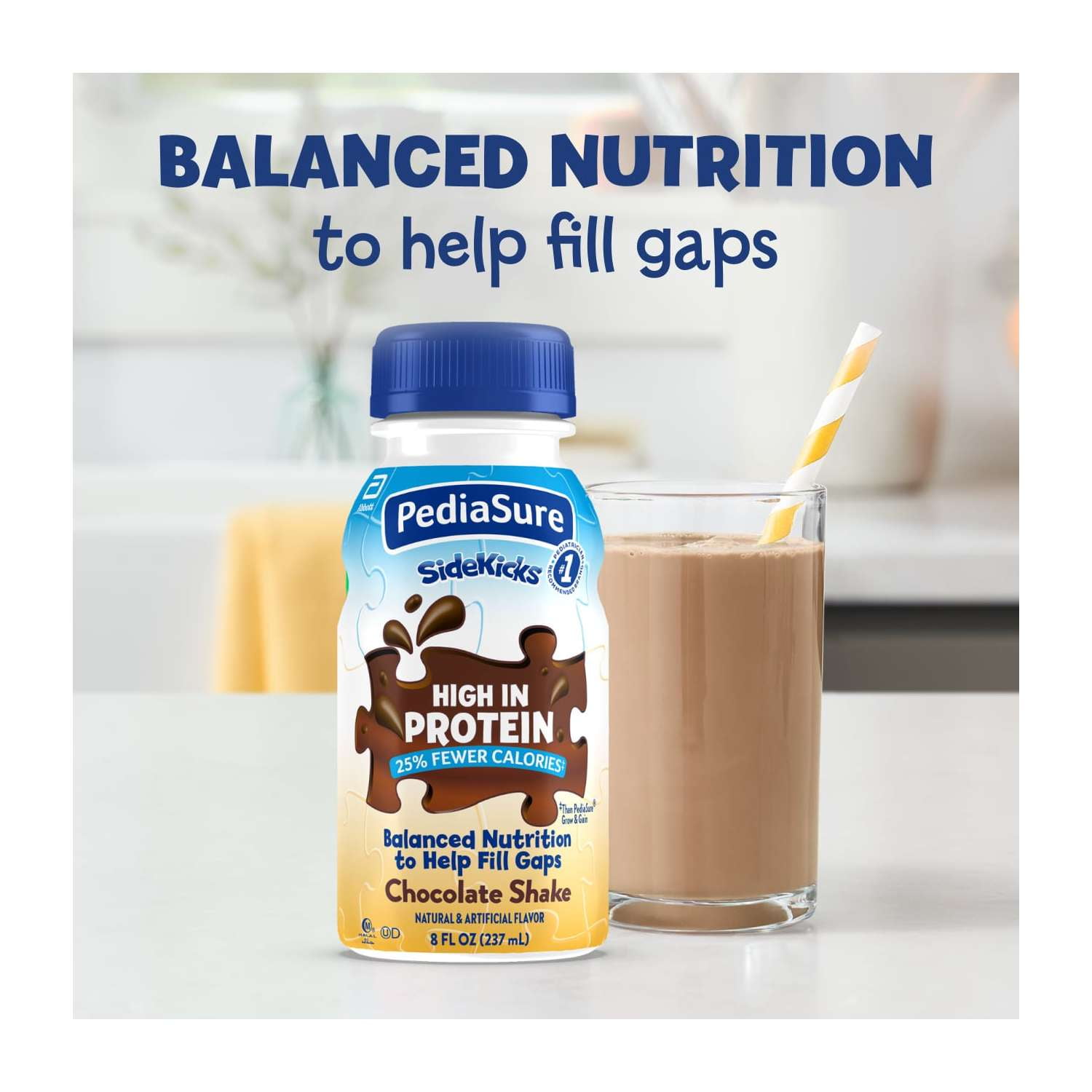 PediaSure SideKicks nutrition shakes have balanced nutrition to help kids catch up on growth. Each protein shake has 10g of protein, 27 essential vitamins & minerals, and 3g of fiber* for kids who may be missing key nutrients. PediaSure is the #1 pediatrician-recommended brand. PediaSure SideKicks is available in two delicious, kid-approved flavors: Chocolate and Vanilla.