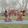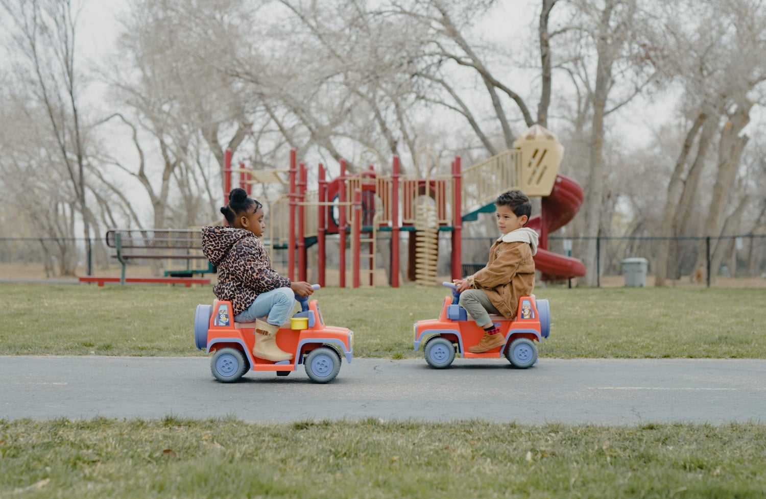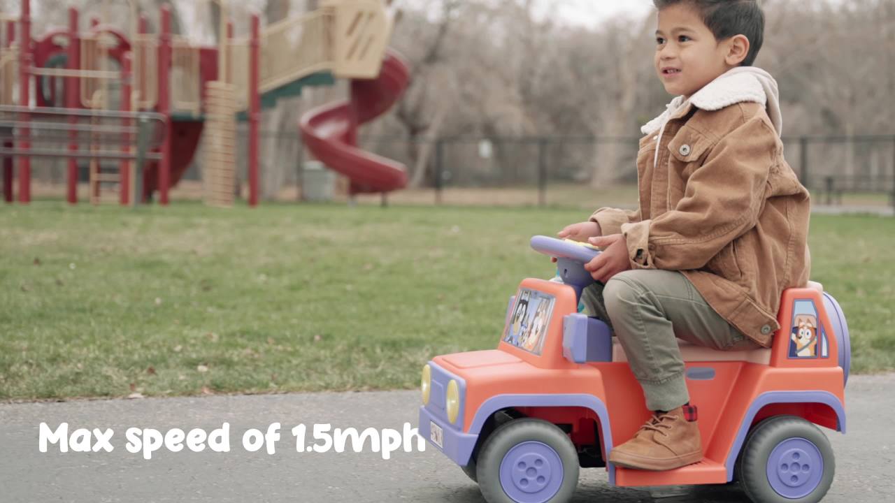 Go on a fun family adventure with the Bluey Ride-On Car! Your toddler gets to join Bluey and Bingo for countless hours of driveway fun on this ride-on jeep designed for children between 24 and 48 months old. The steering wheel plays songs and quotes from the show, including the Bluey Theme and Here Comes the Grannies songs. You can place water or juice in the cup holder, put your favorite toys in the spare tire storage case, and use the adjustable and reflective side mirrors for added realism. Simply plug in the 6 volt battery with the included charger to be ready to play in no time. The Bluey Ride-On Car fits one rider with a 55 pound weight limit and is the perfect toy for boys or girls.