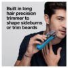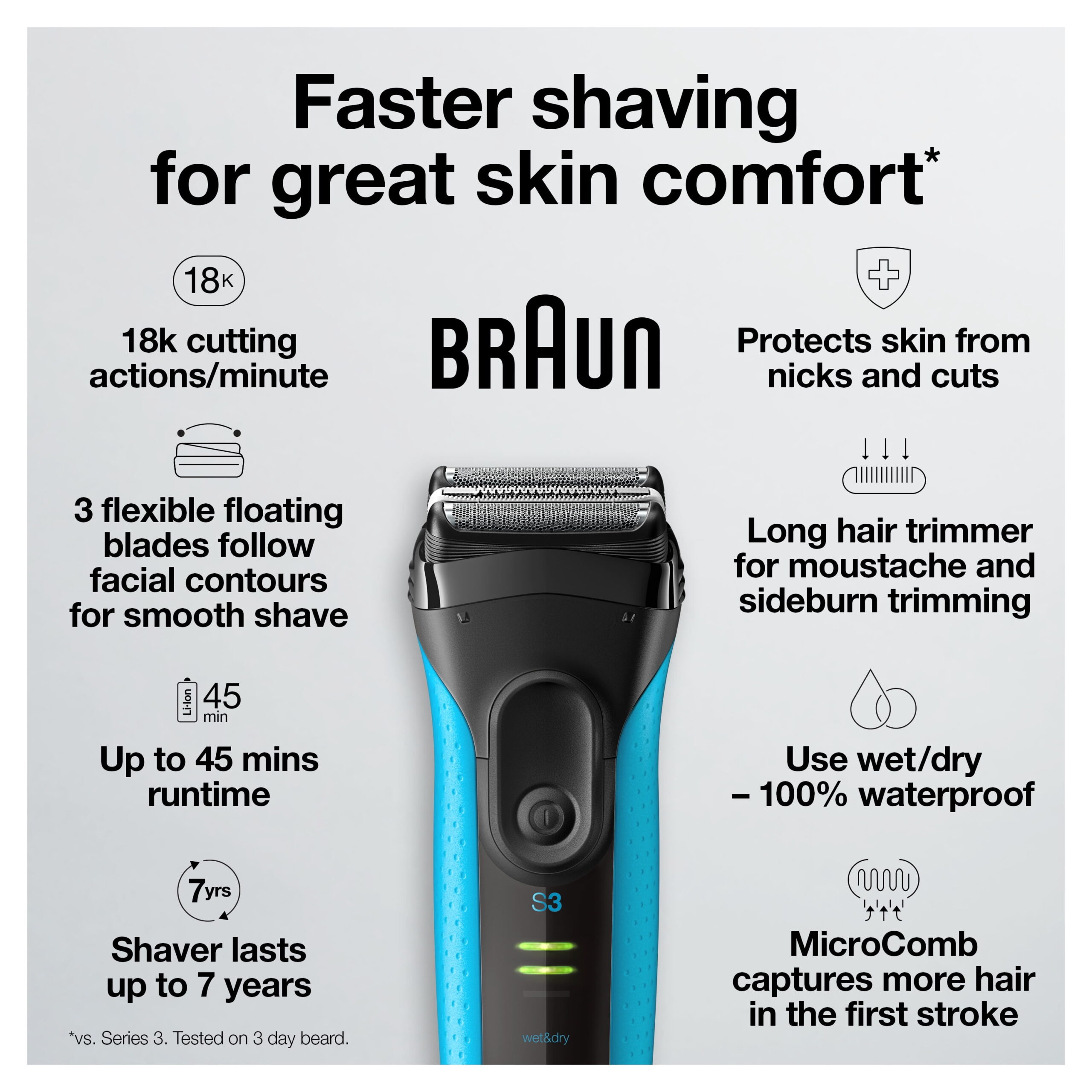 Tough on beards and smooth on the skin, Braun Series 3 ProSkin Electric Shavers for men provide a close shave and perfect skin comfort. New MicroComb technology features two rows of fine, evenly spaced grooves surrounding an independently moving middle trimmer to catch and feed more hair for a faster shave*. The 3-Flex head on this electric shaver uses three pressure-sensitive shaving elements that automatically retract to protect your skin and adapt perfectly to facial contours for a close and gentle shave. Plus, this electric razor is equipped with a precision beard trimmer that slides out of the back for easy and more accurate mustache and sideburn shaping. This wet and dry foil shaver is 100% waterproof and can be used with foam, gel or even under the shower. Plus you can conveniently rinse the face and beard shaver under running water for easy cleaning. These rechargeable shavers for men include two powerful NiMH batteries with quick charge technology to provide a full shave after only one 5-minute quick charge. All Series 3 ProSkin electric razors for men are made in Germany with premium craftsmanship. *compared to Braun series 3, tested on 3-day beards