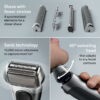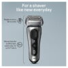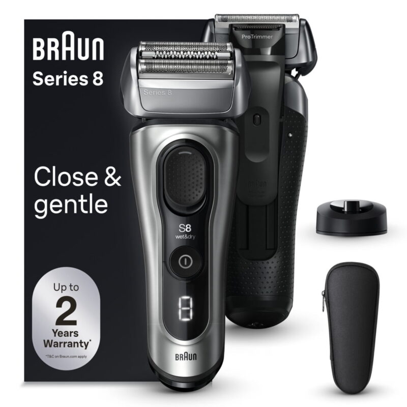 Level up your beard care routine and shave experience with Braun’s upgraded Series 8 Electric Shaver for men. This Braun wet and dry shaver delivers a close and gentle shave even under the chin and nose. Featuring a 40-degree swiveling head and floating blades, this foil shaver gently adapts to facial contours, ensuring closeness and skin comfort. Braun’s unique Sonic Technology uses 10,000 micro-vibrations to help capture more hair while gently gliding over the skin. In addition, AutoSense technology reads and adapts to your beard to provide extra power where you need it most, for a close shave even on dense beards. The ProTrimmer, an integrated precision beard trimmer, slides out of the back of the Braun shaver to easily cut tricky hair-even fine hairs and sideburns. Braun Series 8 8517s rechargeable shavers for men use a powerful Li-Ion battery that lasts for 60 minutes of use and includes a 5-minute quick charge option. These electric shavers for men are 100% waterproof and can be used with foam, gel or even under the shower. All Series 8 men’s electric shavers are made in Germany with premium craftsmanship.