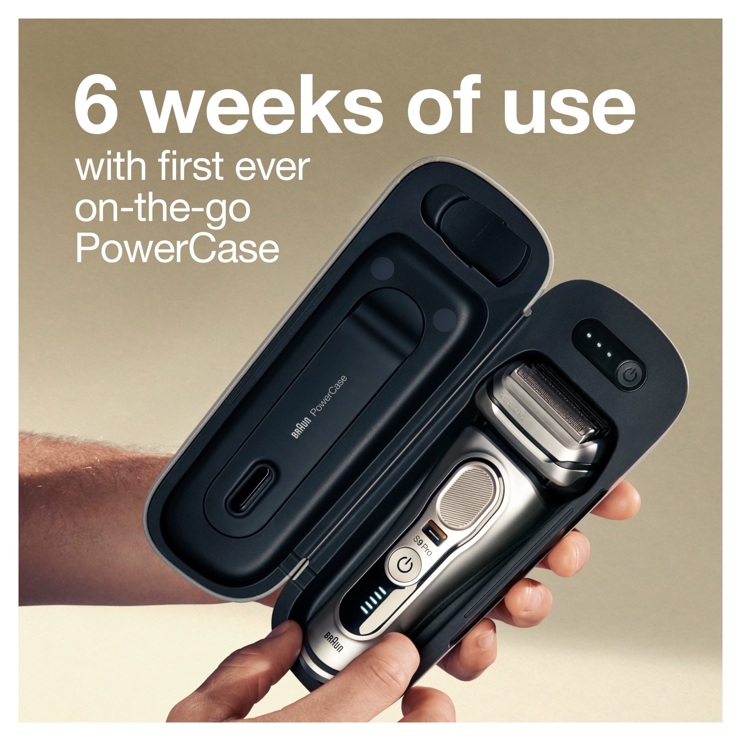 Braun Series 9 Pro is the world’s most efficient electric shaver, reinvented to be even better. This wet and dry foil shaver provides you with both a close and gentle shave, no matter if it’s a 1, 3, or 7-day beard. The ProLift trimmer captures and cuts flat lying hair, combined with our unique Sonic Technology to help shave up to 10% faster* for a more gentle shave in fewer strokes. Braun’s AutoSense technology reads and adapts to your beard, providing a close shave even on dense beards. For unparalleled precision and control, this face and beard shaver features a redesigned precision switch to lock the shaver’s head and easily capture tricky hair in those hard-to-reach areas like under the jawline and nose. A precision beard trimmer slides out of the back of the electric razor for easy and more accurate sideburn shaping. You can now shave cordless for longer (60 minutes) with 20% more battery than the previous Series 9. Braun Series 9 Pro 9477cc comes with a Clean & Charge station that cleans, lubricates, dries and charges your electric shaver at the touch of a button, and the first-ever PowerCase: a portable charging case which charges your razor for up to 6 weeks of use (50% more battery runtime). Each shaving kit includes a Smart Plug charger for automatic 100 to 240 voltage adjustment. All Series 9 electric razors for men are made in Germany with premium craftsmanship.