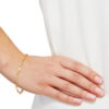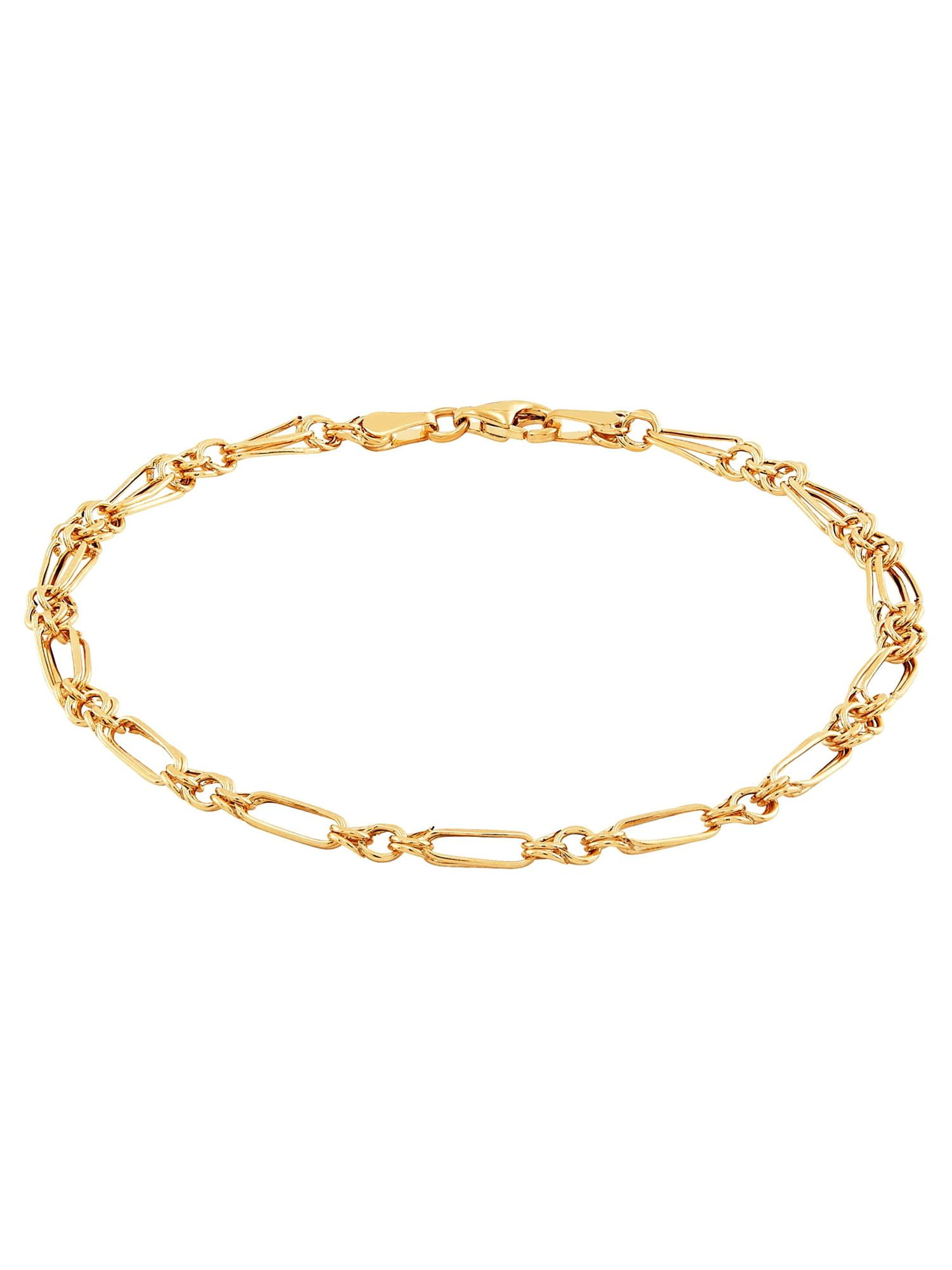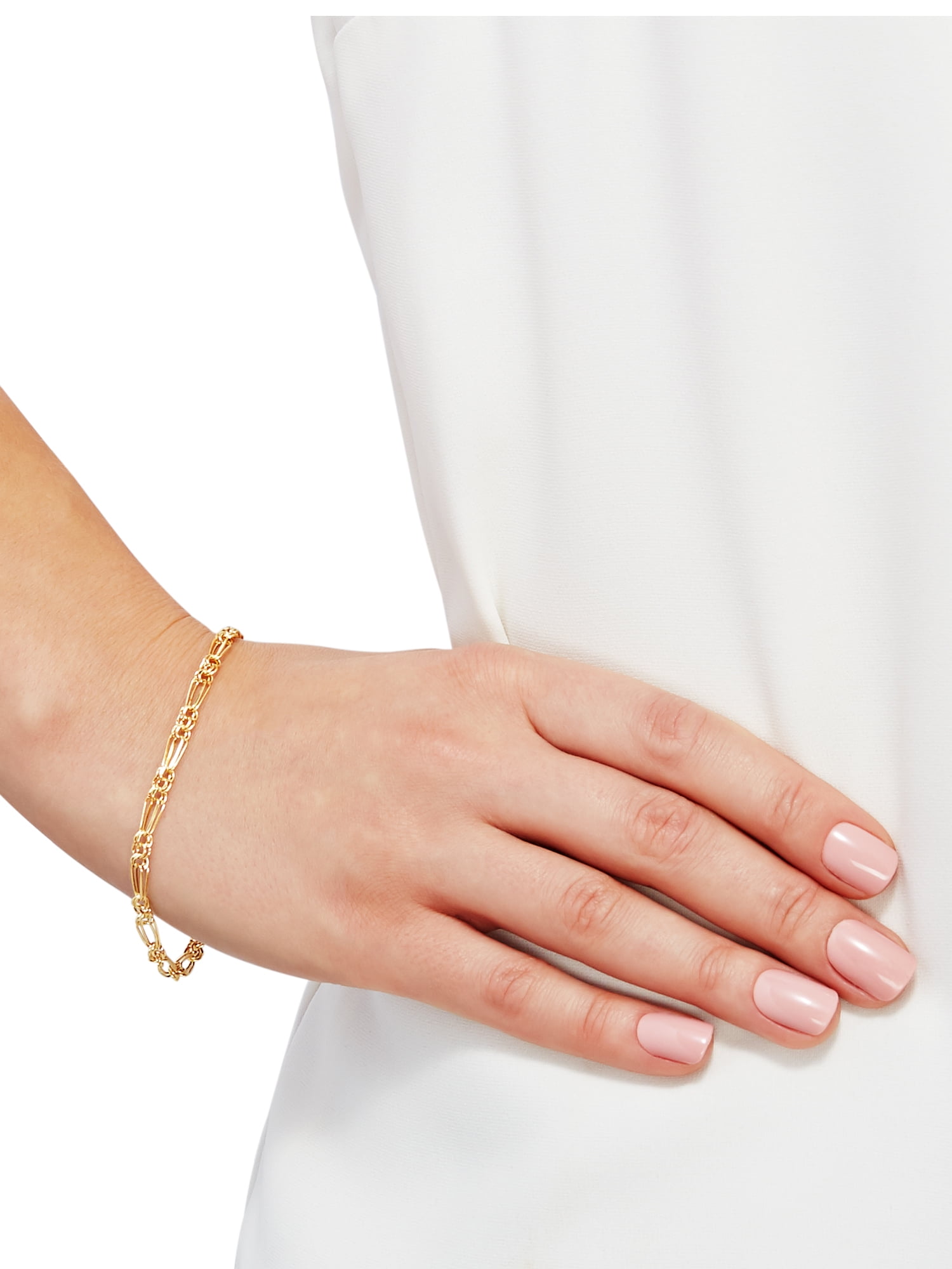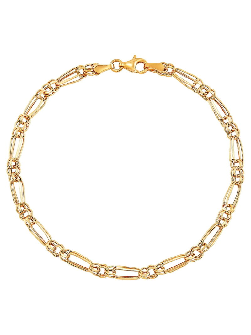 This bracelet offers a fun combination of the classic oval and round shapes. Created in 10K yellow gold with a polished finish, this bracelet is artfully crafted in a alternating style of 1 open oval link for every 3 open round links. In addition, each hollow link used in this bracelet is double layered making this item more durable to wear. This bracelet measures 7.5″ in length and has a lobster claw closure. Womens gold bracelets. Female gold bracelets. Brilliance Fine Jewelry.