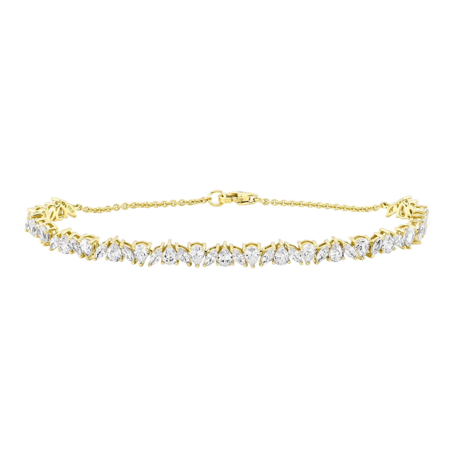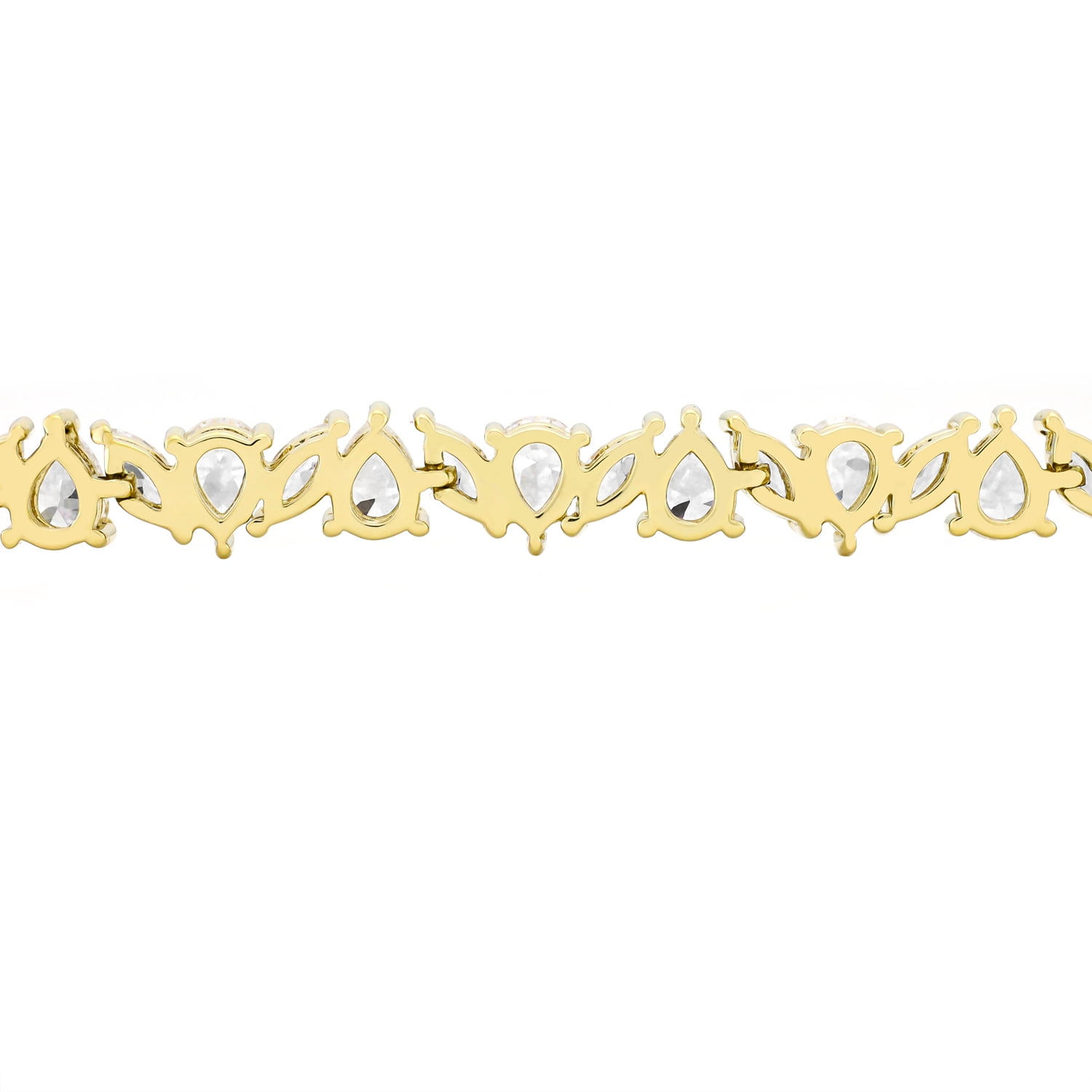 Craftmanship at its finest, this stunning bracelet is a work of art. The design of mosaic composition coupling pear shaped and marquise shaped simulated diamonds is truly unique which showcases your self-expression and personal style. This bracelet can be worn as fashion accessory to complement and enhance any outfit for business, formal or casual wear. The simulated diamonds are set with precious metals of .925 sterling silver and wrapped in 14K gold plating for the epitome of elegance. While the simulated diamonds carpet the top of the wrist, showing off their brilliance, the bracelet continues to wrap around the wrist with 14K gold plated .925 sterling silver chain, ending with a secure round lobster claw. The bracelet measures 7.25”.