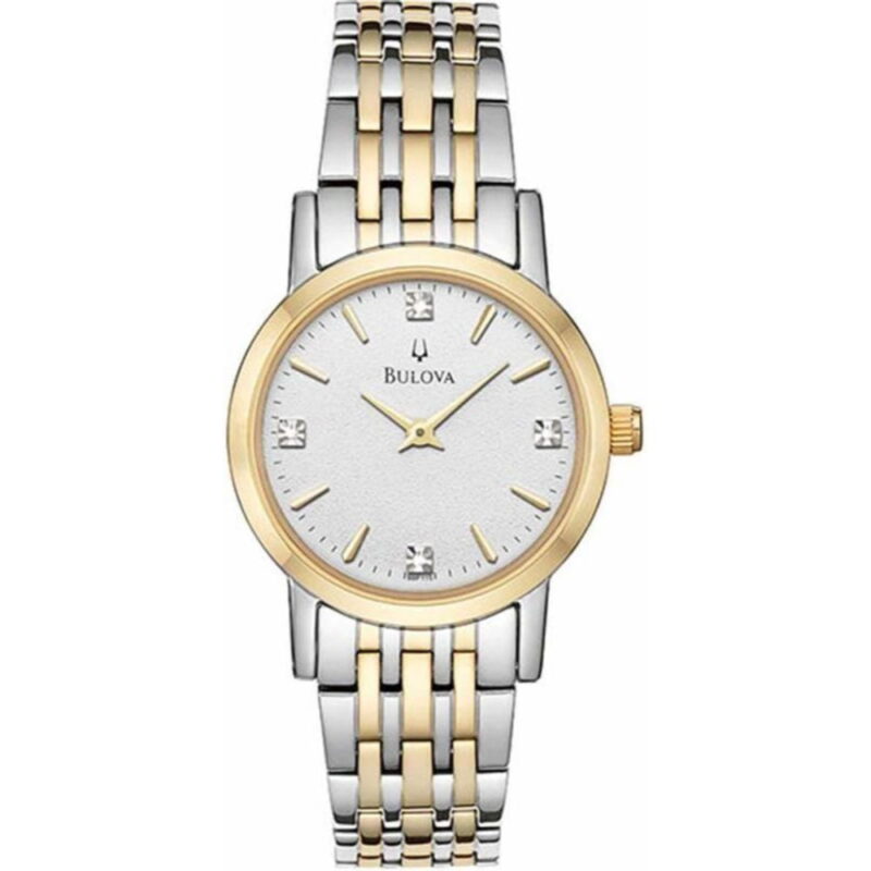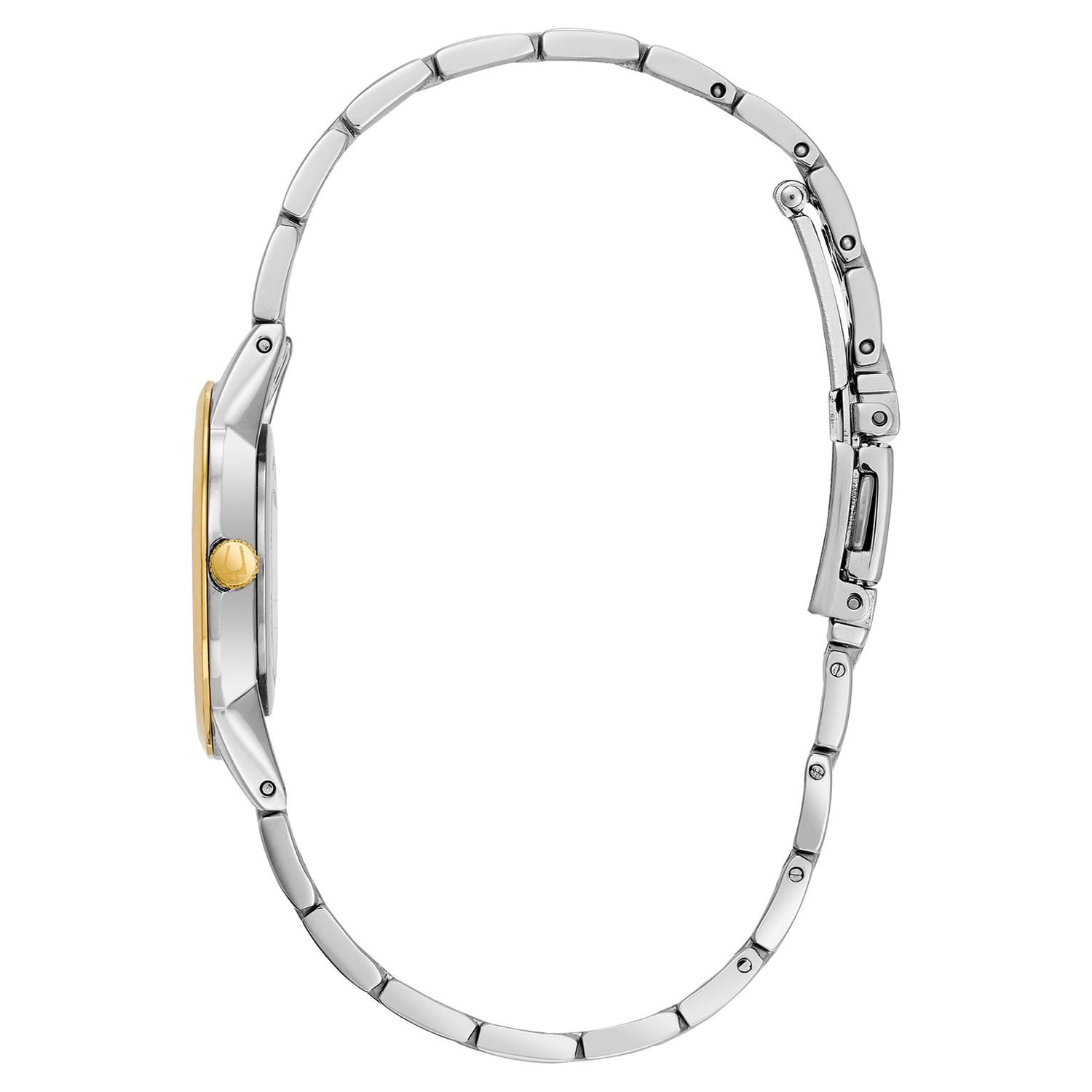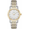 From the Classic Collection. In stainless steel with two-tone finish, 4 diamonds individually hand-set on silver-white patterned dial, and locking fold-over clasp.