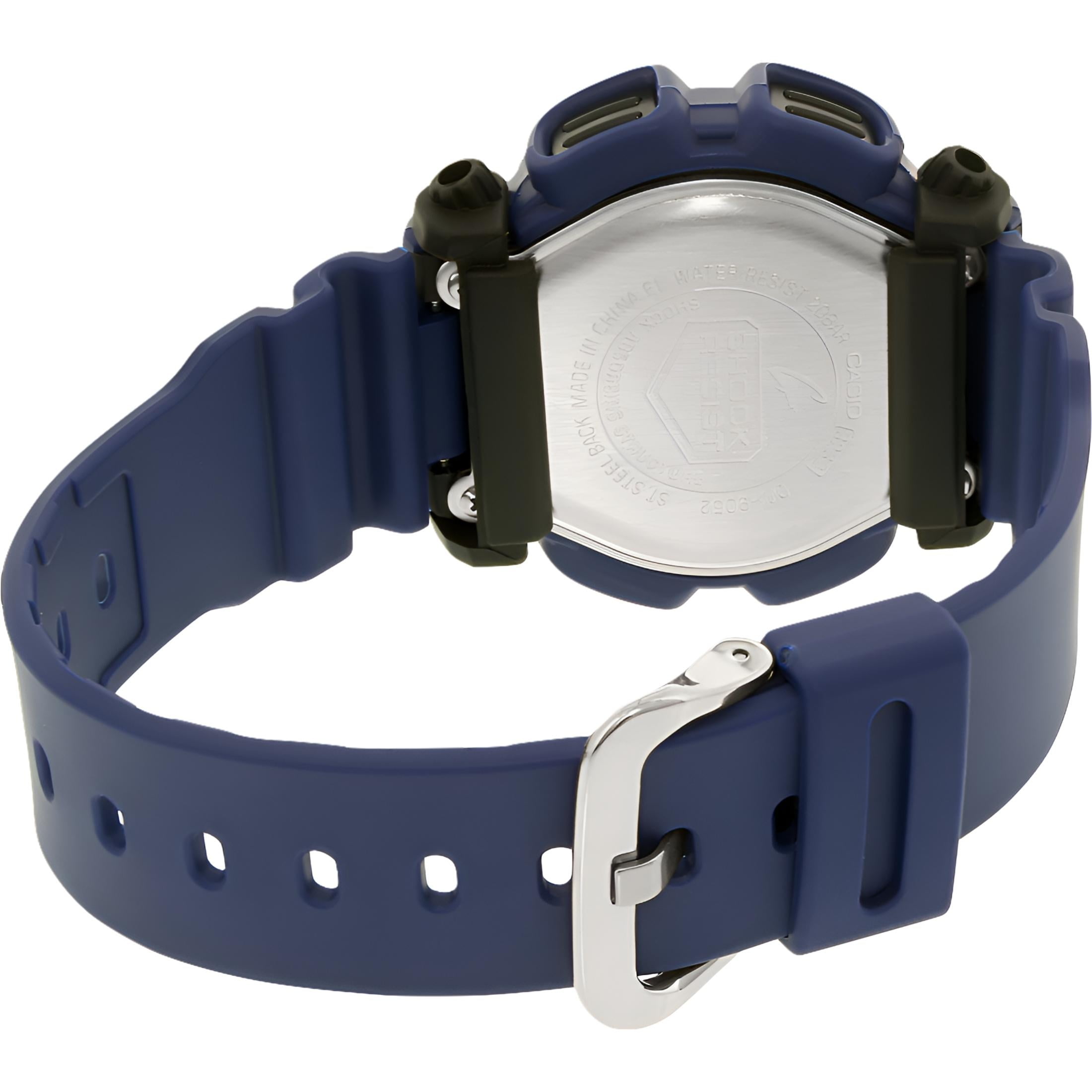 “Necessity is not the mother of invention, invention is the mother of necessity.” These are the words of one of Casio’s founders. The people who created Casio were determined to ‘invent necessity’- to create products that met latent needs with groundbreaking capabilities no one had ever seen before. Ever since, Casio has been doing just that, bringing new discovery and delight to people around the world. This is Casio’s way of building an even more prosperous, richly rewarding world. Silver Digital dial. Blue resin case with a blue resin band. Quartz movement. 200 meters / 660 feet water resistance. Fixed bezel. Scratch Resistant Mineral crystal. Solid caseback. Tang clasp. Case size 45.5 mm x 15 mm. Band 23 mm x long. Casio DW9052-2V G-Shock Watch.