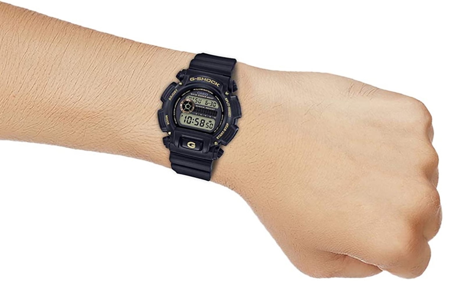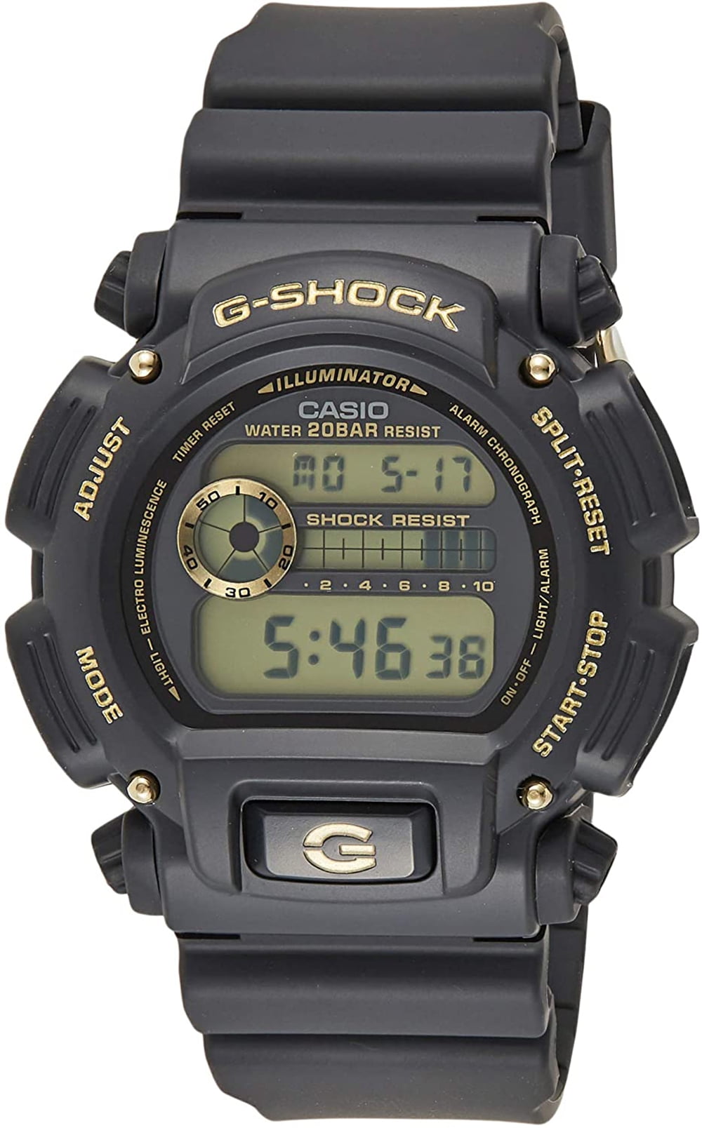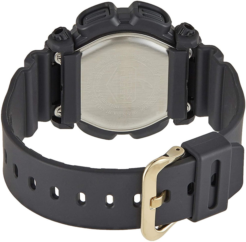 From G-SHOCK, the watch brand that is constantly setting new standards for timekeeping toughness, come new additions to the standard model lineup. The popular DW-9052 big case starts out with basic G-SHOCK black, which is then accented with brilliant rose gold and gold accents. The new gold-accented designs are really attractive additions to the G-SHOCK lineup. Standard Issue never looked this good! Ideal for outdoor and everyday wear, this Casio G-Shock DW9052GBX-1A features full 200M water resistance, shock resistance, and a 24 Hour stopwatch countdown timer. Suitable for professional marine activity and serious surface water sports, but not scuba diving.