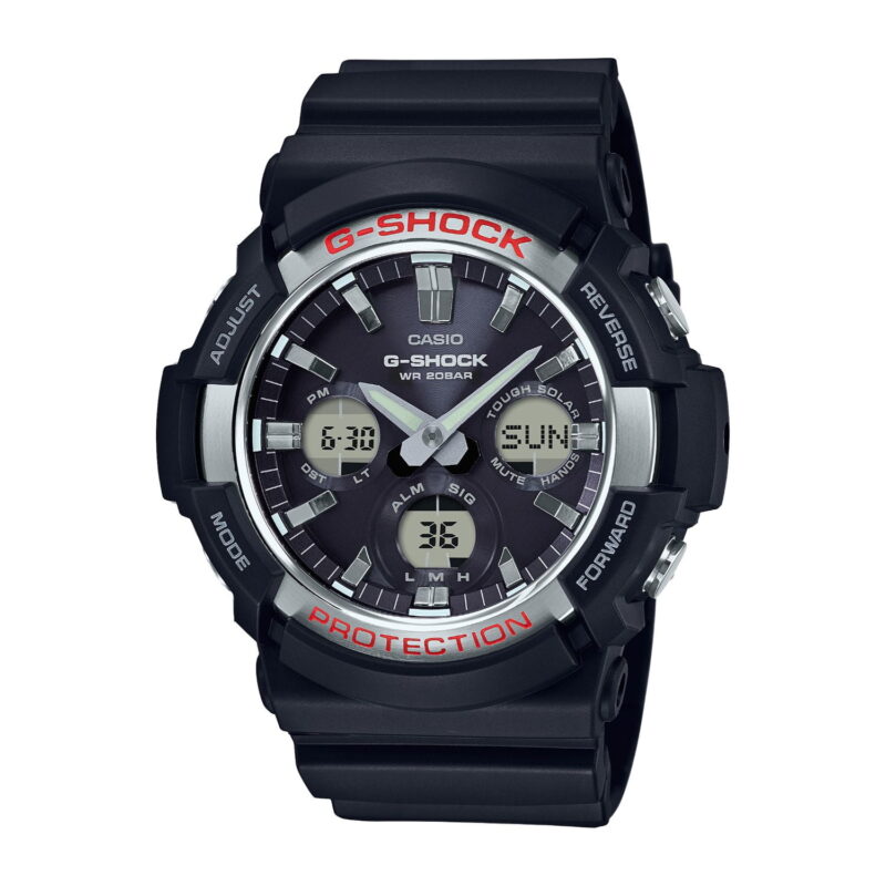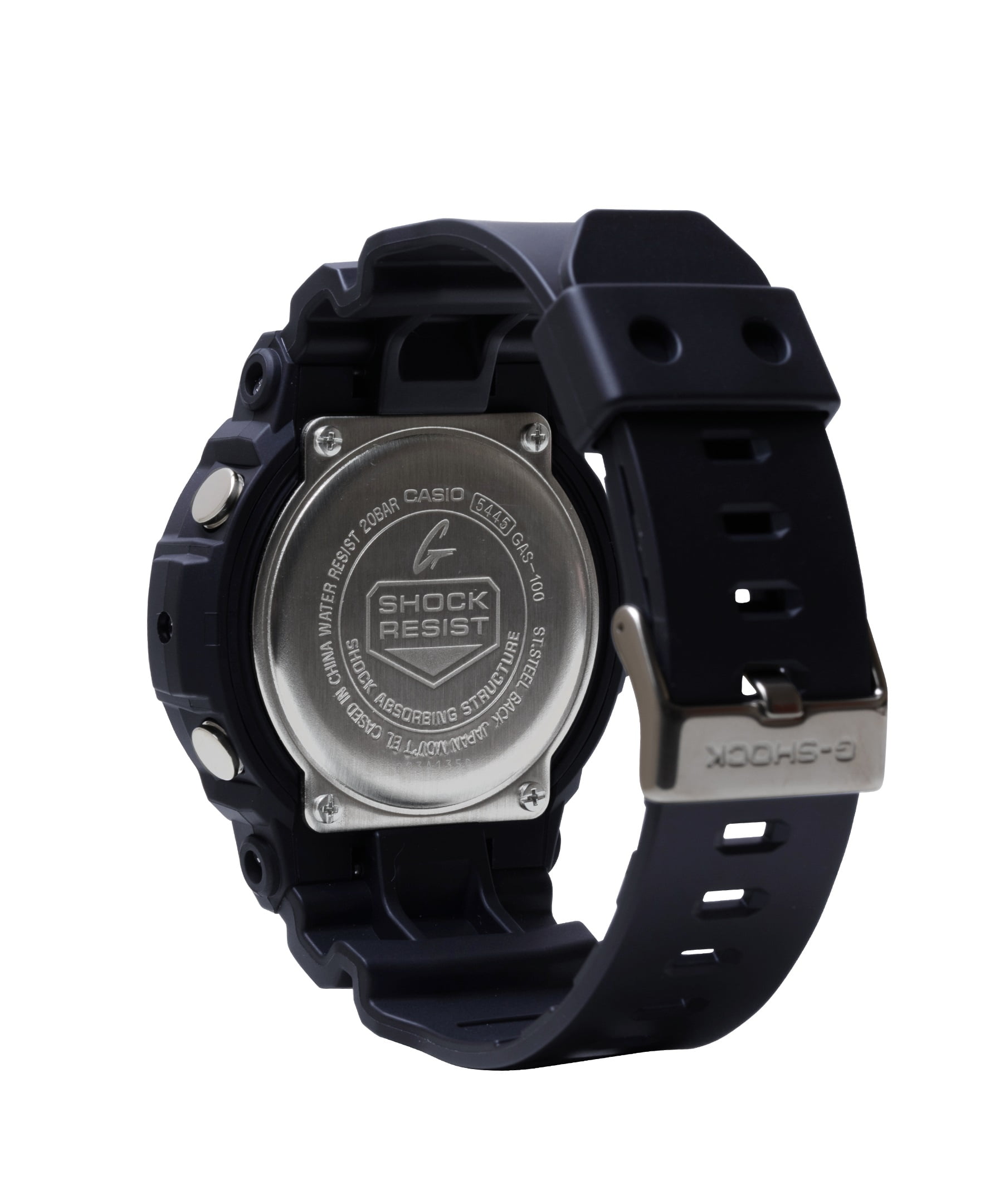 The Casio G-Shock Shock Resistant Tough Solar GAS100-1A Men?s Watch is a shock-resistant men?s watch for guys who are active and like to explore both land and sea. It boasts AM/PM Display that can tell you the date and time in any world time zone you choose. It has 31 Time Zones (48 Cities + UTC) with Button Operation Tone On/Off as well as Hand Shift Feature. To further help you get organized, the G-shock also has a Full Auto-Calendar (To Year 2099). A great blend of analogue and digital display, this G-shock also has a 1/100-Second Stopwatch, a Countdown Timer, Hourly Time Signal and a 5 Daily Alarms.