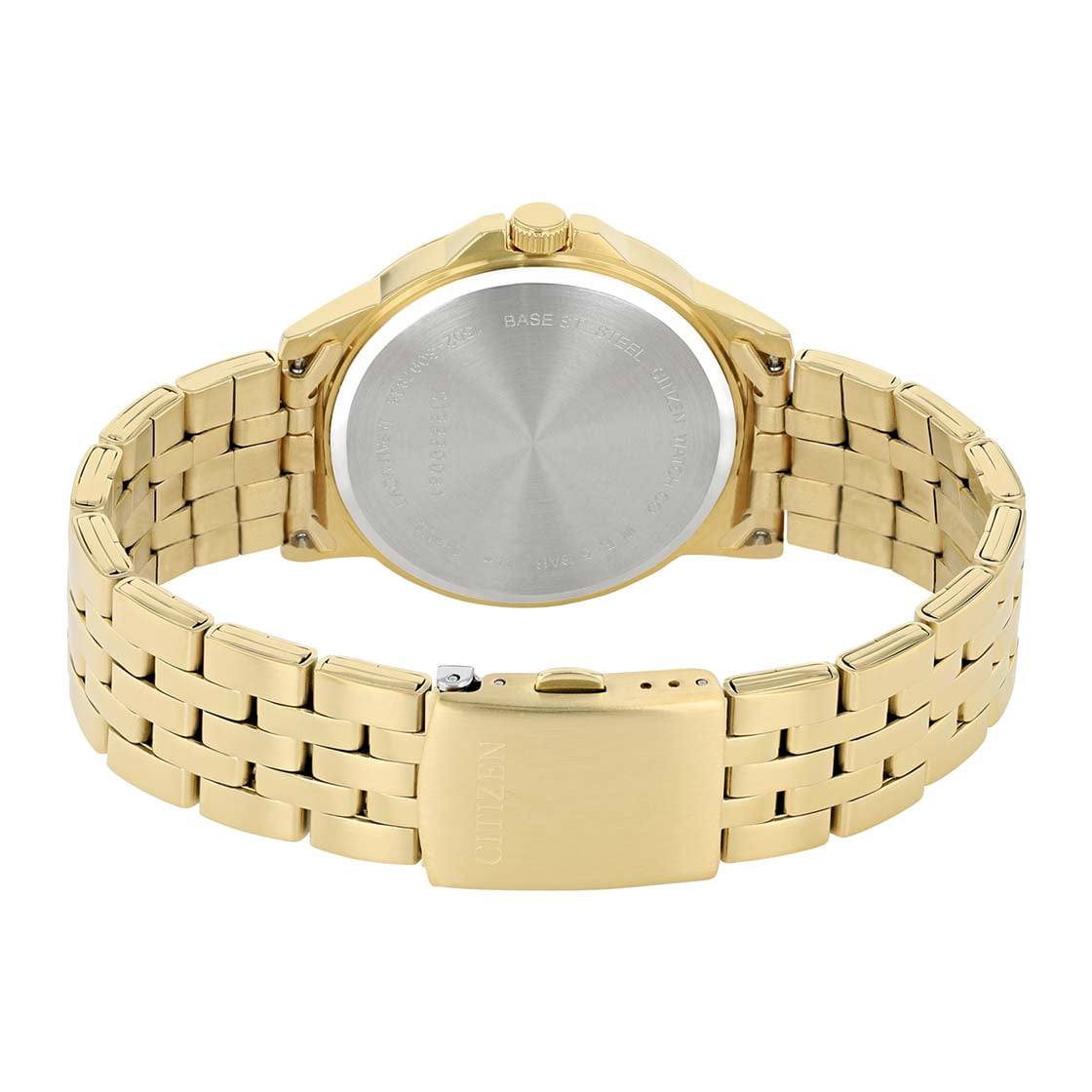 Black dial enhanced by luminous gold-tone hands. Gold-tone stainless steel case with a gold-tone stainless steel 1 band. Quartz movement. 50 meters / 165 feet water resistance. Fixed bezel. Scratch Resistant Mineral crystal. Solid caseback. Fold Over with Push Button Release clasp. Pull / Push crown. Case size 41 mm x 9 mm. Band 21 mm x long. Citizen BF2013-56E Watch.