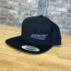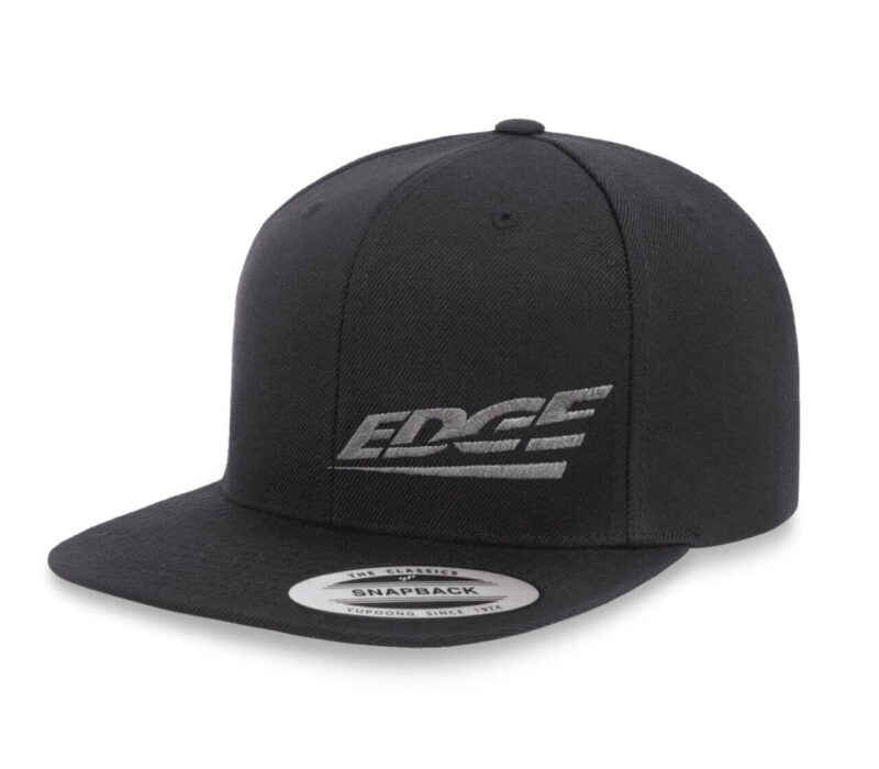 Snapback Style Flat Bill Cap. All Black design with Grey stitch Edge logo on front left panel. Sold Individually.;