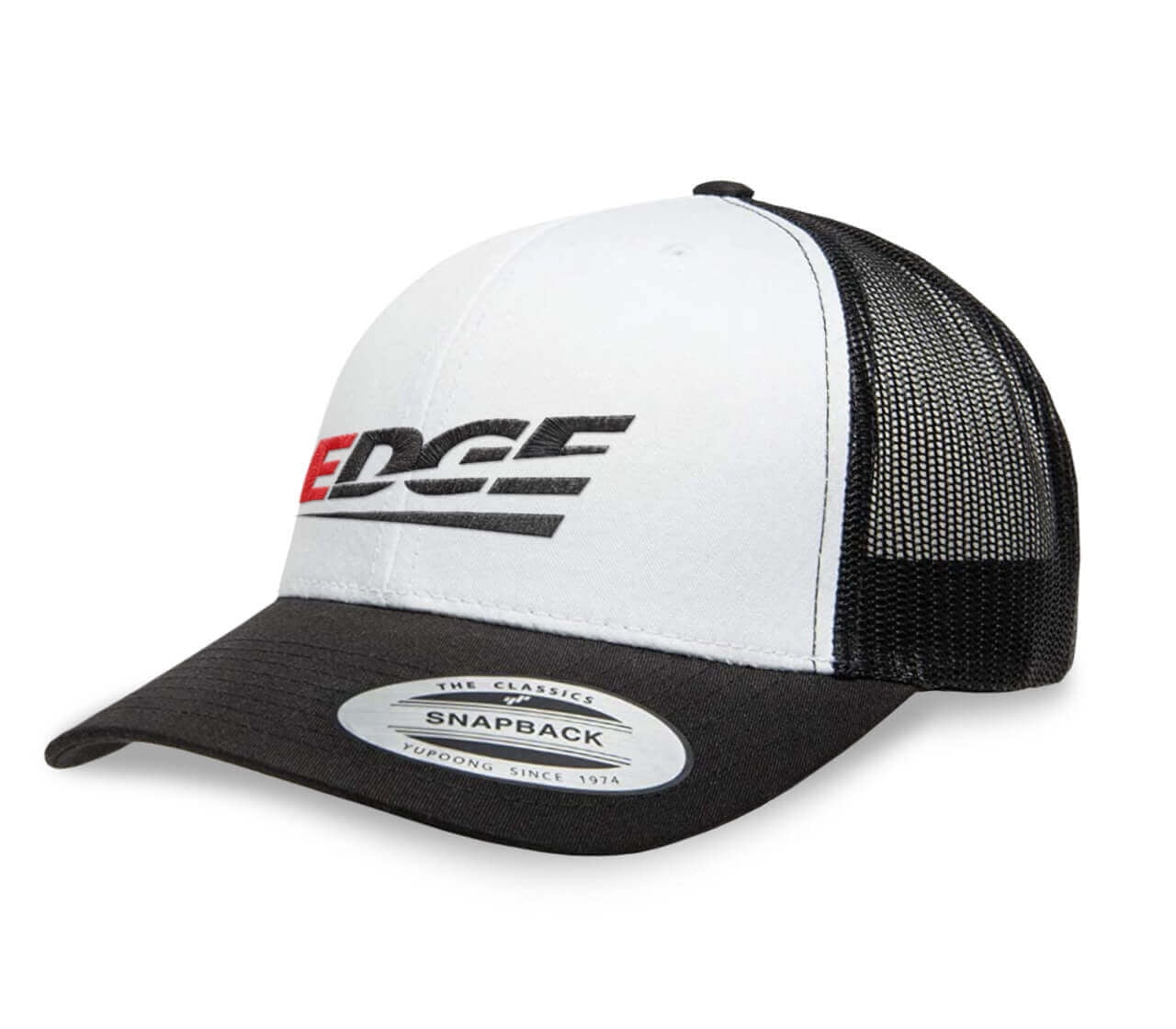 Snapback Style Cuved Bill Cap. Black mesh and front bill design with white front panels with stitched Edge logo centered on front panels. Sold Individually.;