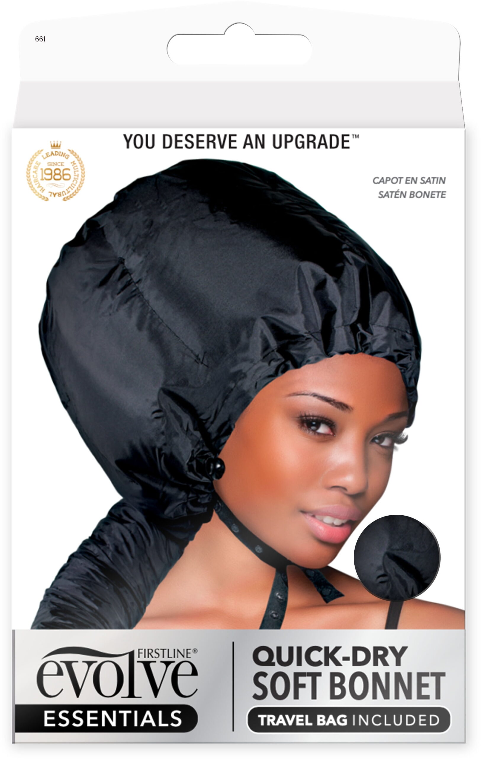 Use the Evolve Quick-Dry Soft Bonnet to intensify deep conditioning and color processing, or dry roller sets and twists. This accessory easily converts a hand-held dryer to a professional hair drying system. Adjustable drawstring and chin strap. Made in China. Fabric Content: 100% Polyester.