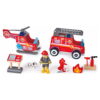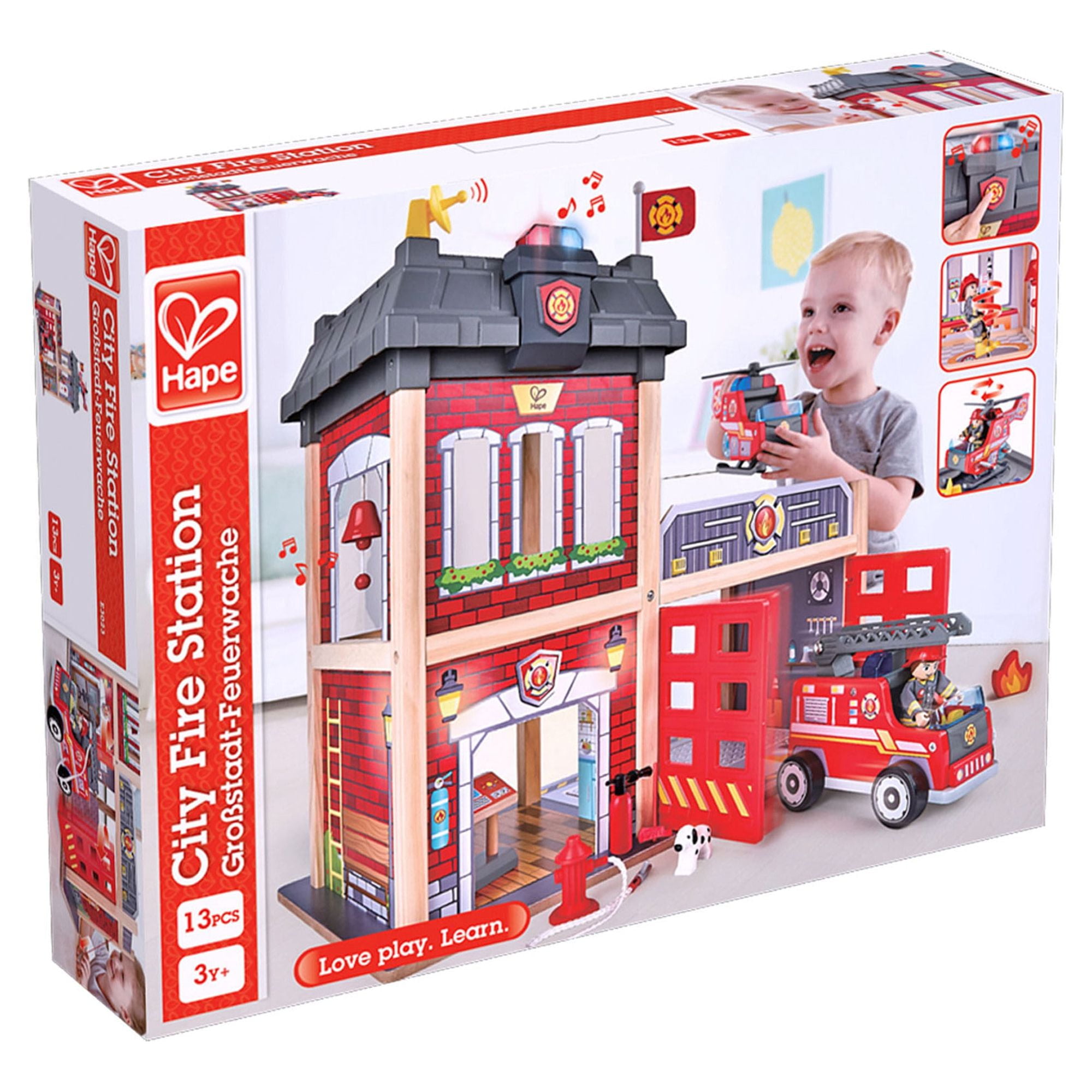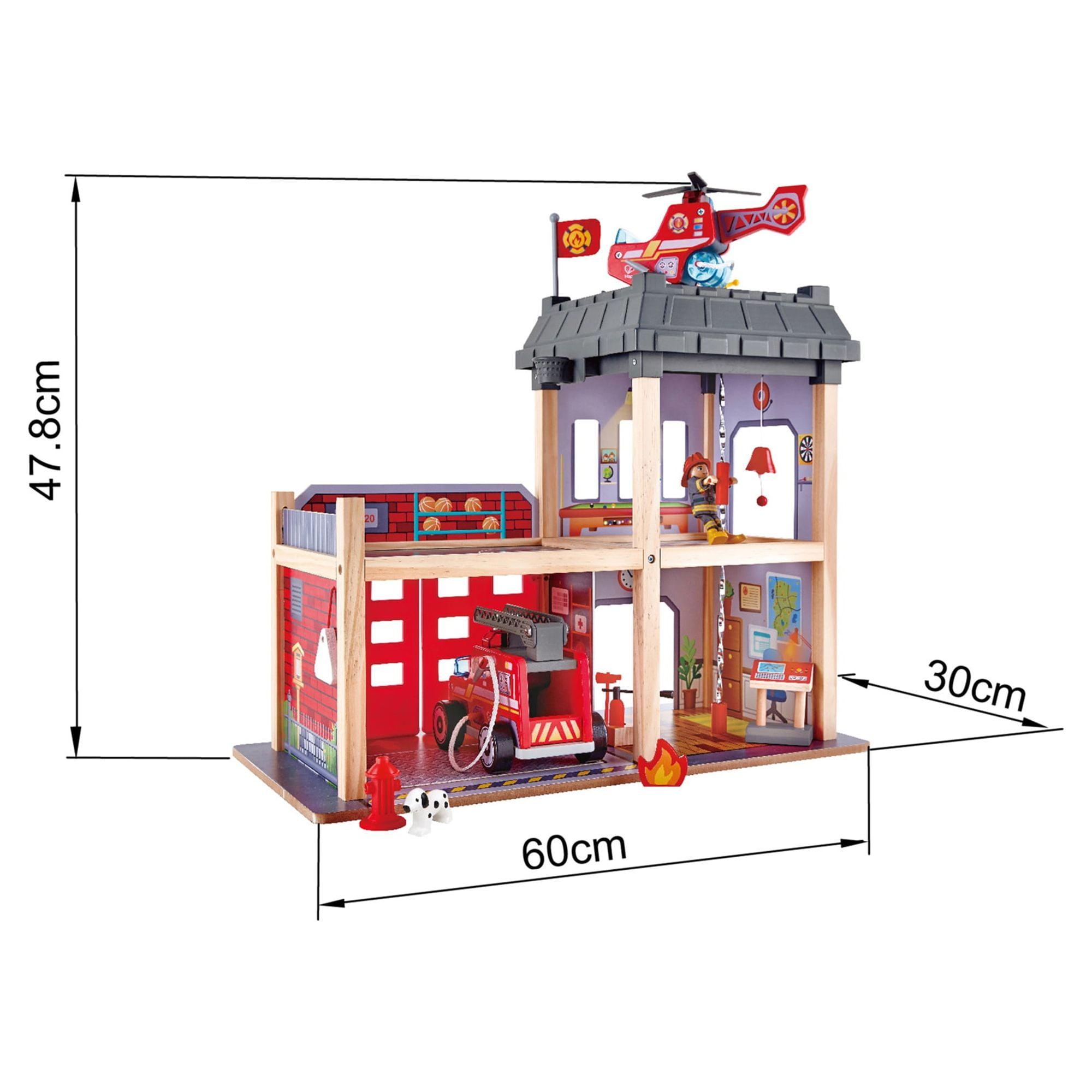 HAPE CITY FIRE STATION PLAYSET – Get ready for rescue adventures with the Hape Dollhouse Fire Station! This feature-packed station is beautifully crafted in wood, with realistic Industrial details to bring your stories to life. Levels Of Fun! Explore 3 levels of fun, from the rooftop helipad to the garage with working doors. The Hape Fire Station comes with a wooden helicopter and a fire engine for storytelling adventures. Lift off from the helipad or pull the string to launch the engine from the garage and race to the rescue. Ring the alarm bell and send the firefighter whizzing down the pole from the rec room to the office. Lights and fire bell sounds bring the firefighting fun to life. There is even a flame-shaped piece kids can pretend to put out with the fire extinguisher or the fire engine’s hose. A rescue dog, bed, desk, stool and treadmill add to the roleplay possibilities, so little ones can play out a whole day in the life of the firefighter. The Hape Fire Station comes with a fire engine, helicopter, figures and accessories crafted from durable wood, making it a beautiful addition to any playroom. This wooden fire station features natural textures and bright colors designed to stimulate your little one’s senses. With Hape Toys, you can trust that all materials are non- toxic, child safe, and of the highest quality. Product Height 18.82 inches.
