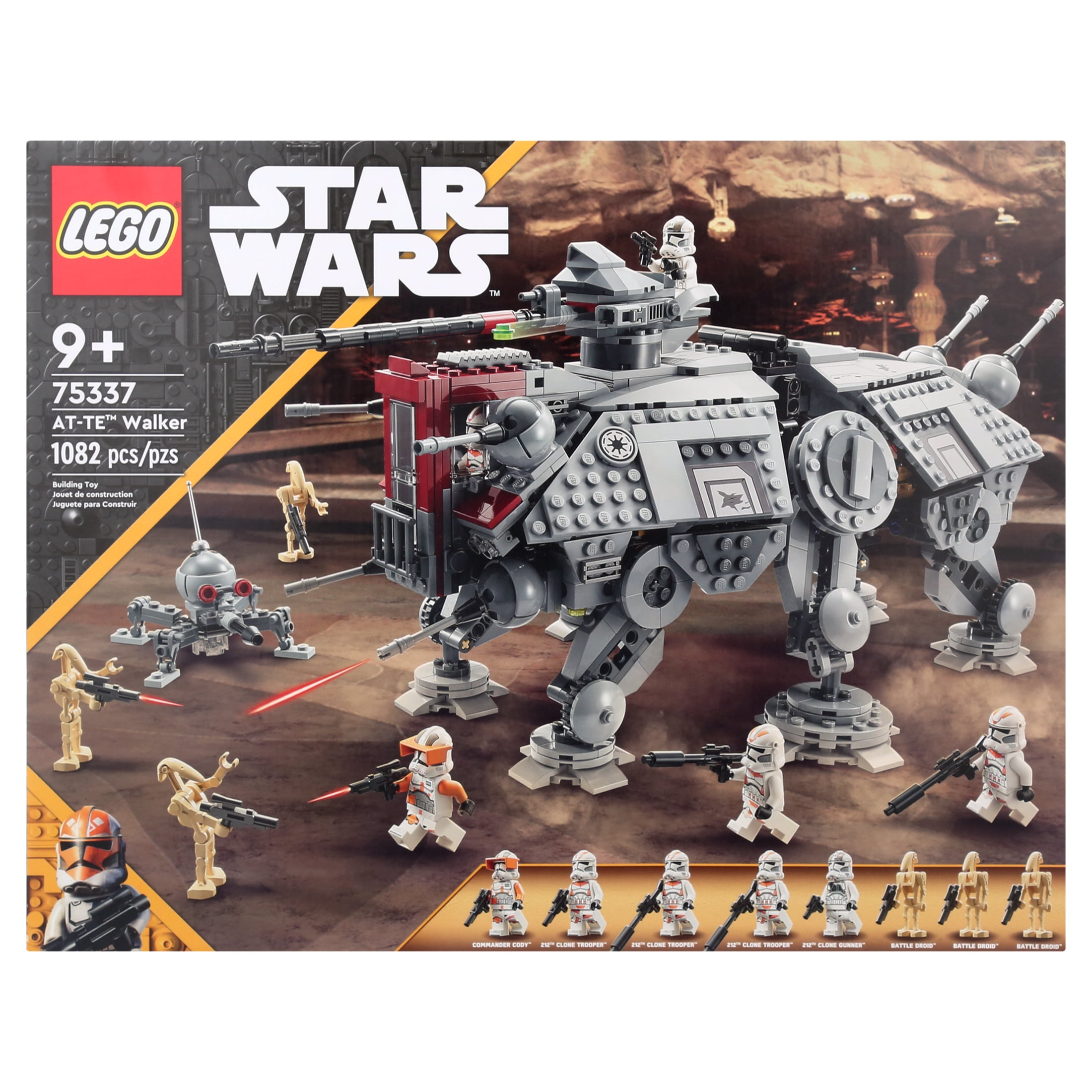 Young Padawans can recreate the Battle of Utapau with this fantastic LEGO Star Wars AT-TE Walker (75337). A great gift idea for Star Wars: Revenge of the Sith fans aged 9 and over. This Star Wars building toy features posable legs and a 360-degree-rotating elevating heavy blaster cannon with 2 stud shooters. There is a detachable minifigure cockpit and 2 detailed cabins with space for up to 7 LEGO minifigures in total. Each of the cabins opens for easy play and an extendable handle makes it simple to lift and move the Star Wars AT-TE model. The set includes 5 LEGO Star Wars minifigures – Commander Cody, a 212th Clone Gunner and 3 212th Clone Troopers – to pit against 3 Battle Droid LEGO figures and a buildable Dwarf Spider Droid, plus assorted cool weapons. Kids will find building instructions in the box and on the LEGO Building Instructions app, which has interactive viewing tools to enhance the creative experience. Explore the entire LEGO Star Wars collection to discover other construction toys to delight fans of all ages. AT-TE Walker measures over 7.5 in. (19 cm) high, 17 in. (44 cm) long and 9.5 in. (24 cm) wide. Contains 1,082 Pieces.