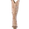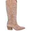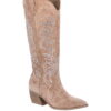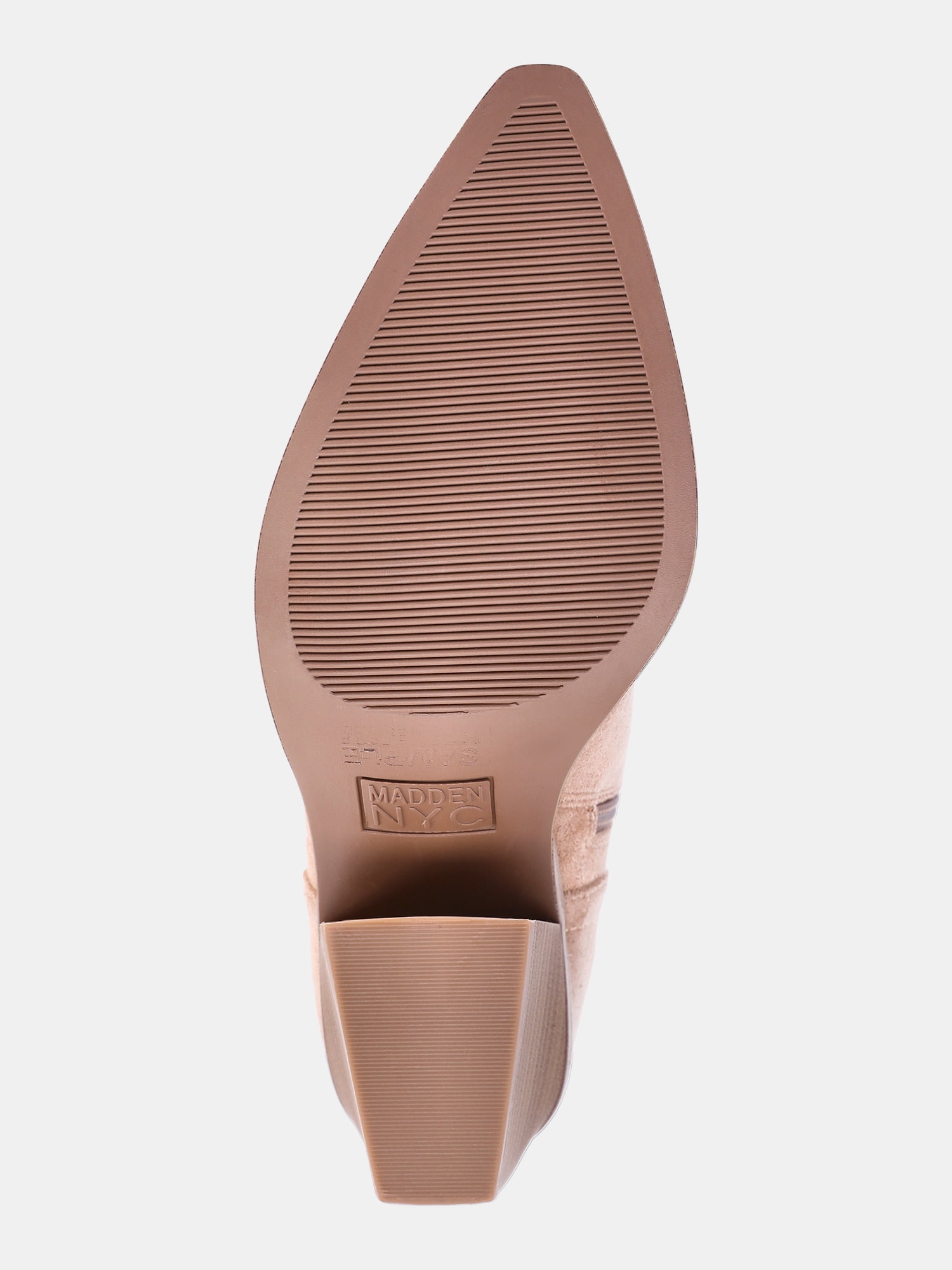 These chic Madden NYC Studded Western Boots blend classic cowboy style with modern glamour. These women’s boots are crafted with a soft tan finish, featuring intricate swirling embroidery adorned with sparkling rhinestones for a touch of elegance and sophistication. The tall shaft showcases traditional Western stitching, while the pointed toe and stacked block heel create a flattering silhouette. Designed for both comfort and style, these boots are perfect for dressing up casual outfits or making a statement at festivals, concerts or nights out.