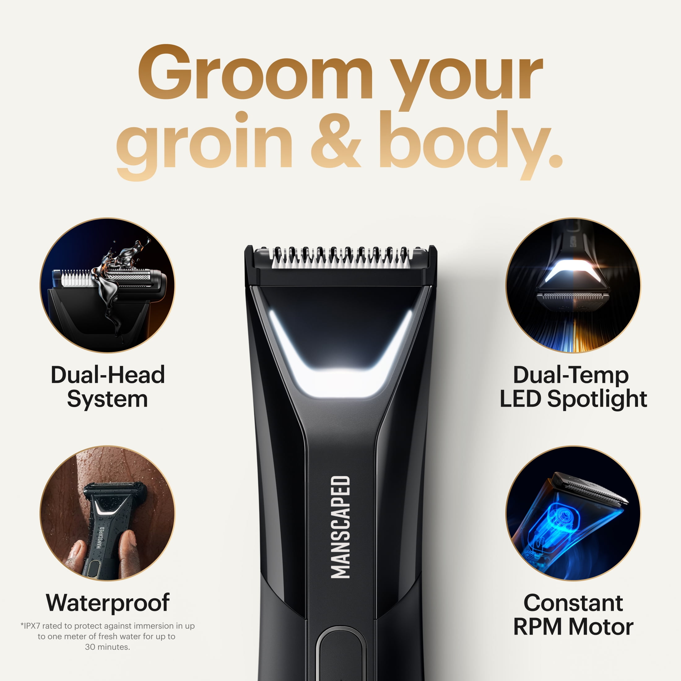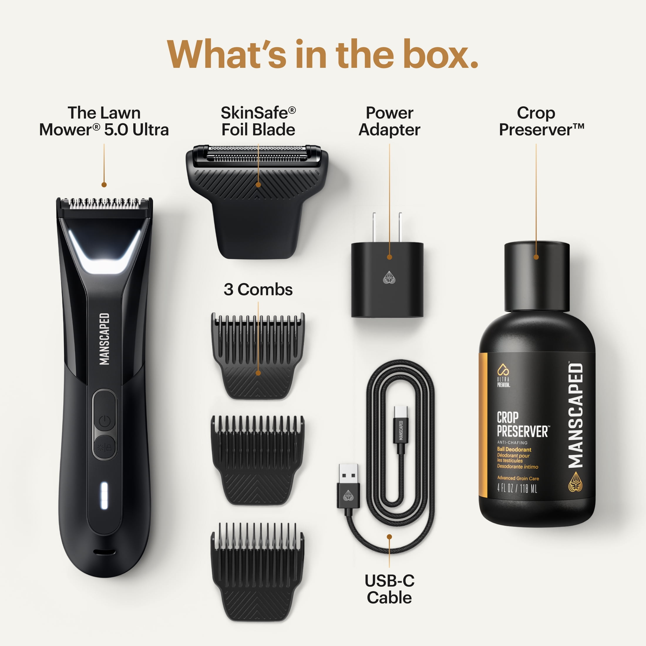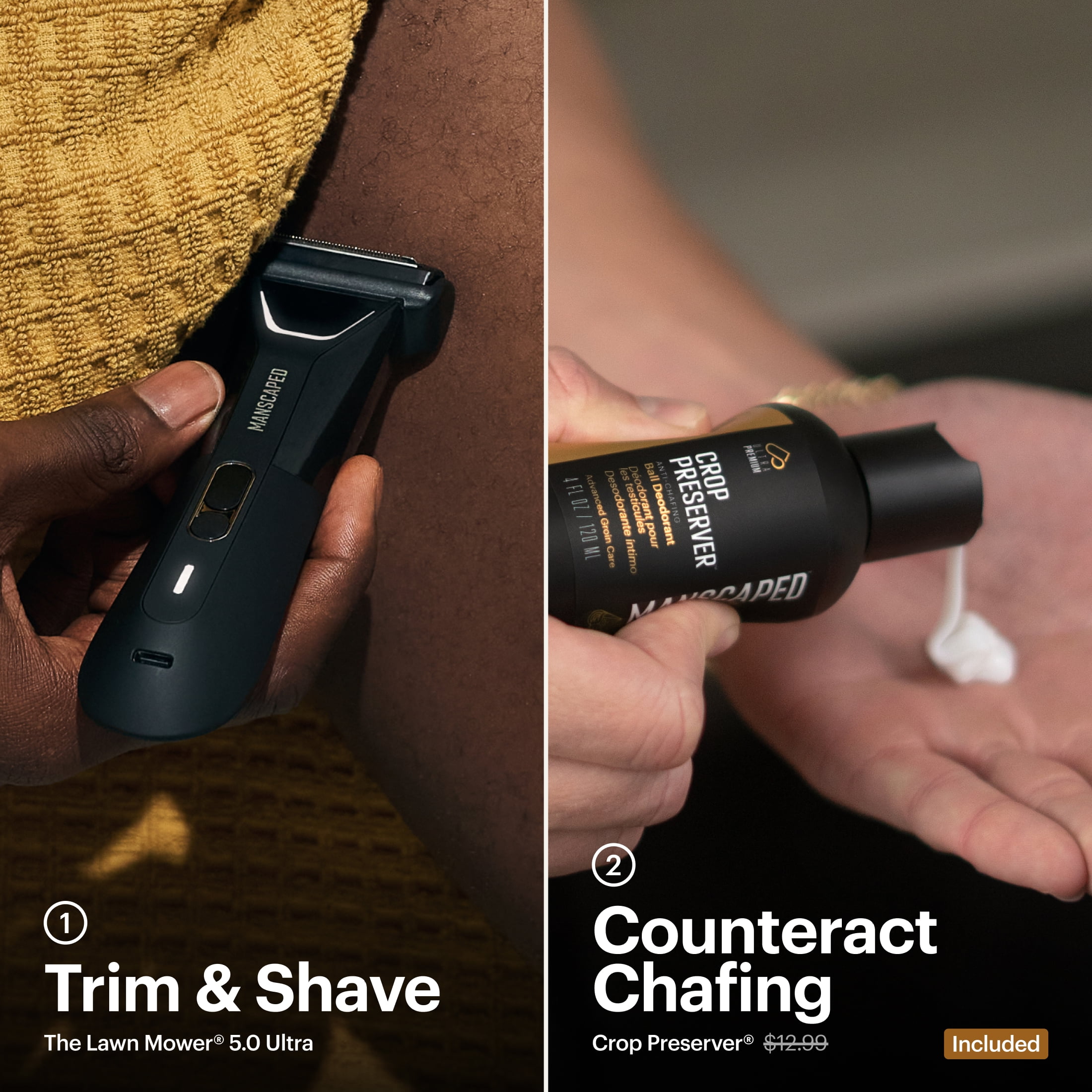 The MANSCAPED® Lawn Mower® 5.0 Ultra Precision Pack features The Lawn Mower® 5.0 Ultra electric trimmer and Crop Preserver™ groin deodorant to keep your boys dry and comfortable. With an advanced dual-head system and SkinSafe™ blades, The Lawn Mower® 5.0 Ultra is a next-gen groin groomer that’ll give you the power to trim, shave, and shape to your liking. This next-level male trimmer is cordless, waterproof, and delivers constant power for a smooth shave. It also comes with interchangeable blade heads and adjustable trimming guard sizes for different hair lengths. The convenient multi-function button gives you access to a dual-temp spotlight or travel mode. Crop Preserver® is our uniquely formulated, all-in-one deodorant and moisturizer designed specifically for below-the-waist and highly active areas. Anti-chafing lotion features ingredients that help preserve the skin’s essential barrier and maintain all-day freshness.