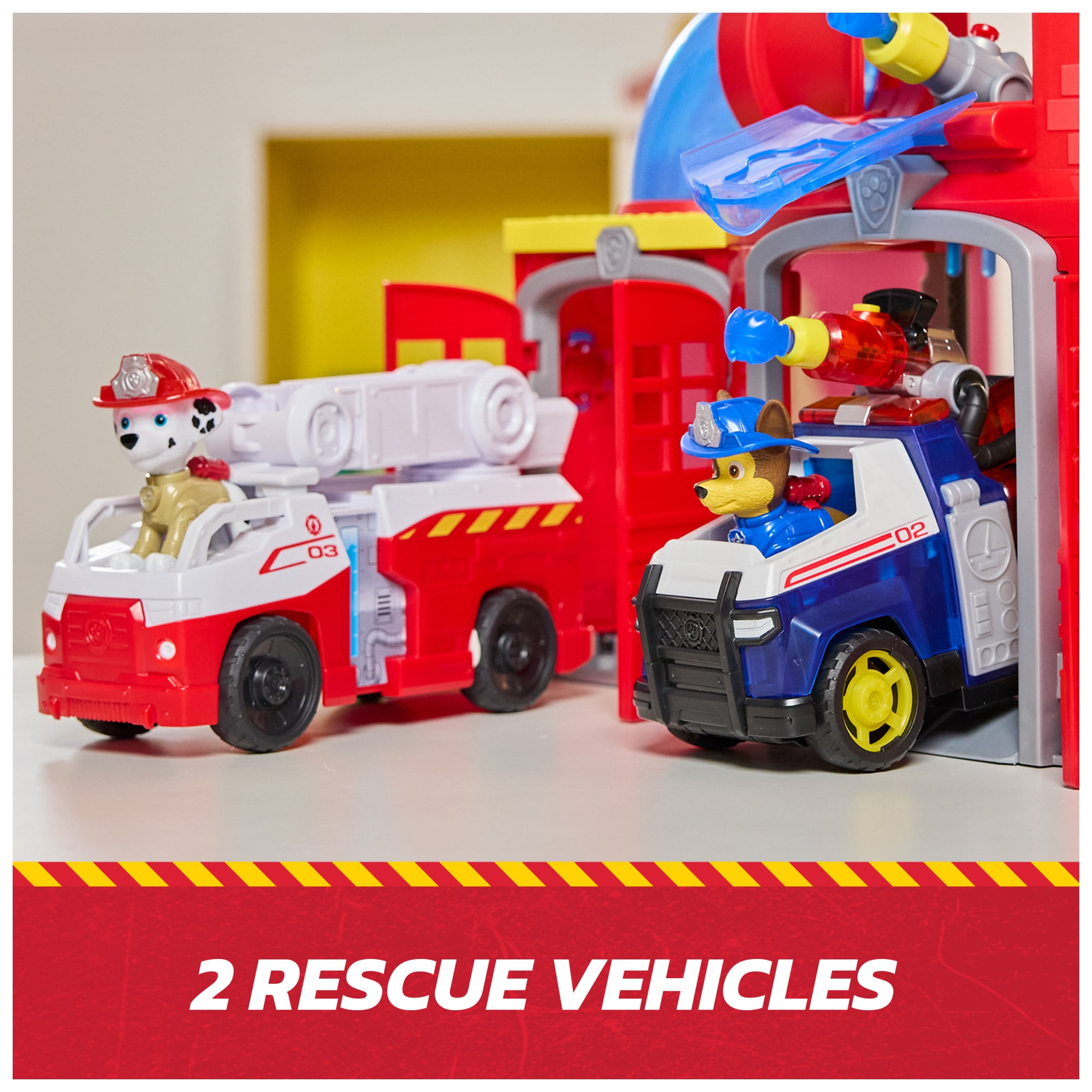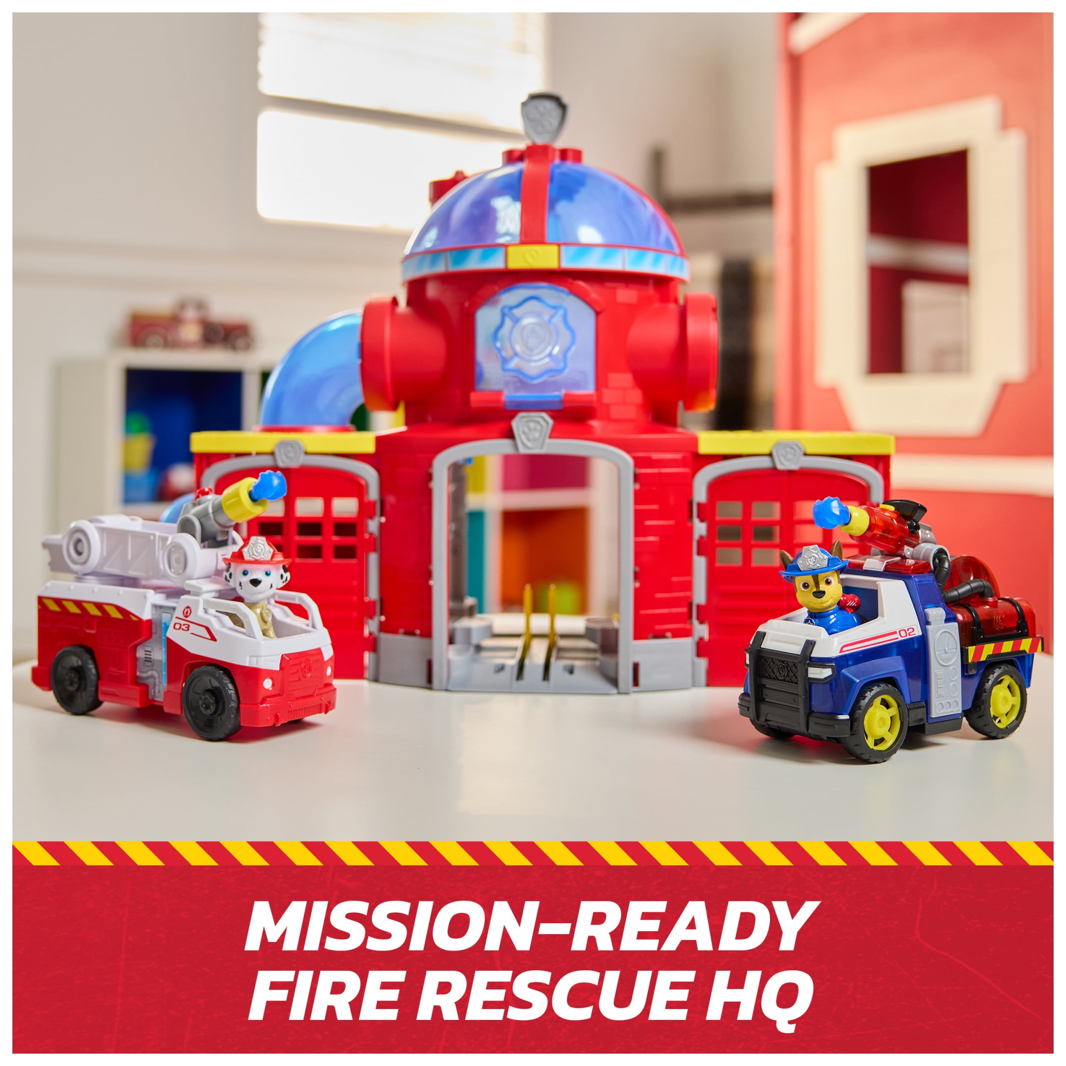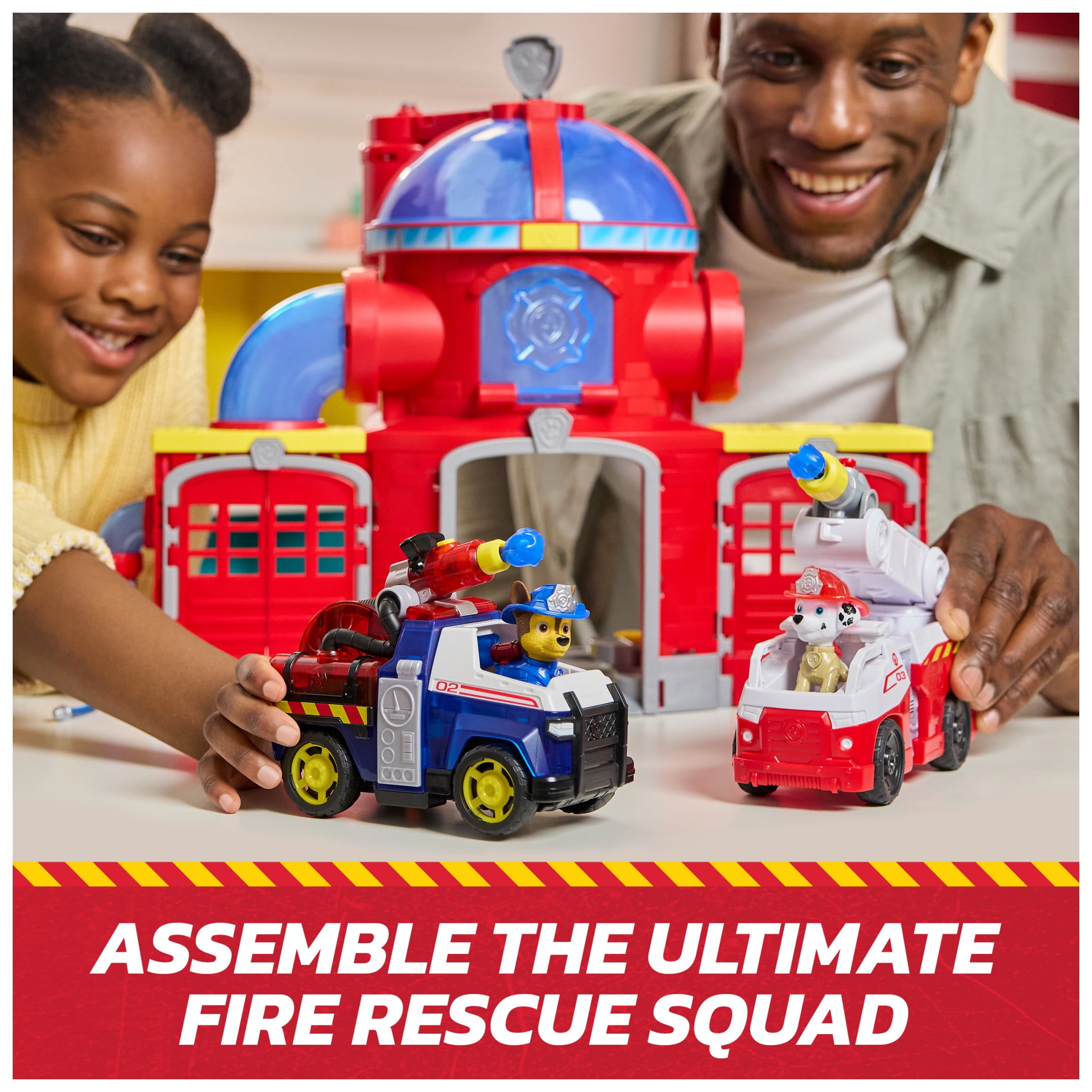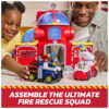 Get ready for a heroic adventure with the PAW Patrol Fire Rescue Ultimate Fire Rescue Command Center! Standing 15 inches tall, this action-packed playset is loaded with features like thrilling lights and sound effects. It includes Marshall and his rescue fire truck, complete with a detachable ladder for those daring rescue missions, and Chase’s rescue fire cruiser, with built-in projectile launcher. The fire station mirrors the one from the show, featuring a projectile launcher and various play areas like a vehicle launcher, landing pad, drop tube, and fire pole. Kids can enjoy pretend play by loading water projectiles and launching them with a push of a button, placing Chase or Marshall onto the fire pole and watching them spin down to the lower level, then launching them in their rescue vehicles! For even more fun, combine with the Fire Rescue Command Center, Rapid Reload Fire Truck & six different Fire Rescue figures & vehicles, so the excitement never ends. (each sold separately) Relive cherished moments from past PAW Patrol seasons, like the Mighty Pups and PAW Patrol Movie, or create new adventures with a PAW Patrol tower, individual PAW Patrol action figures and their PAW Patrol vehicles, for turbo-charged adventures.