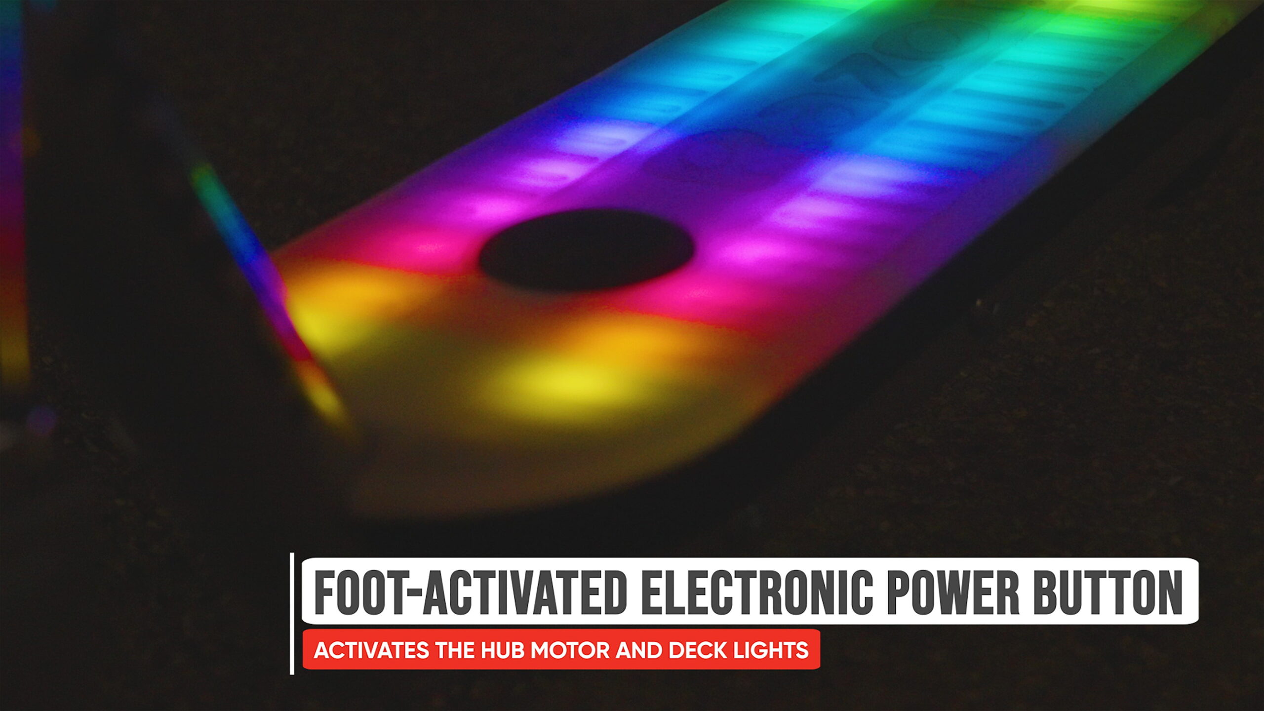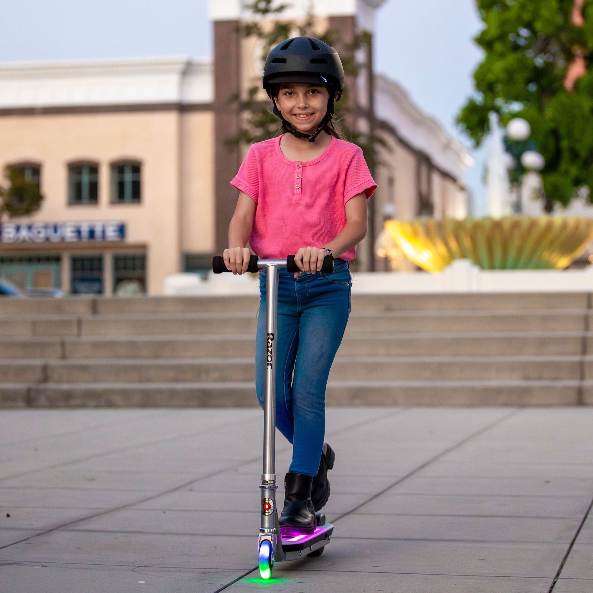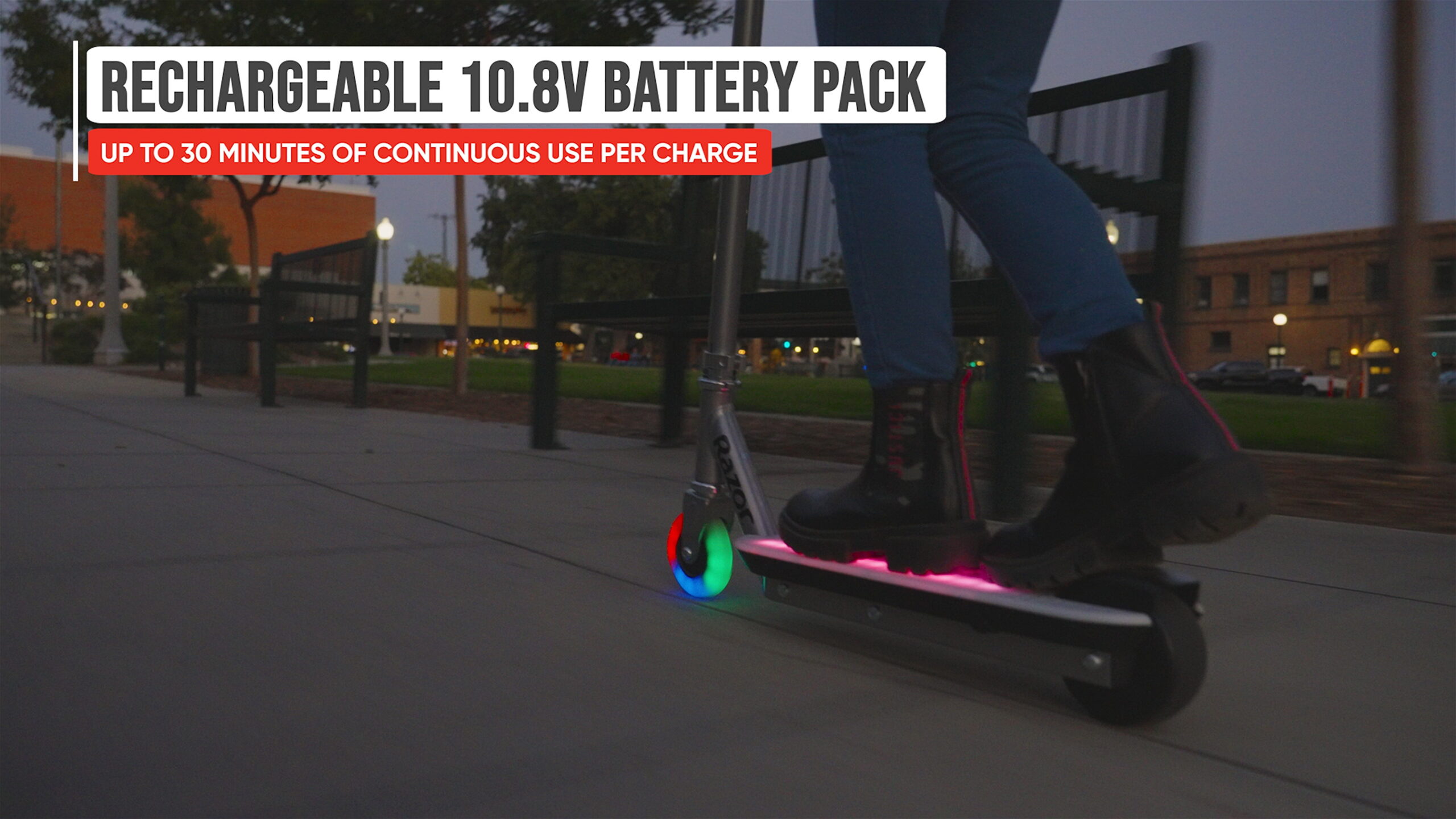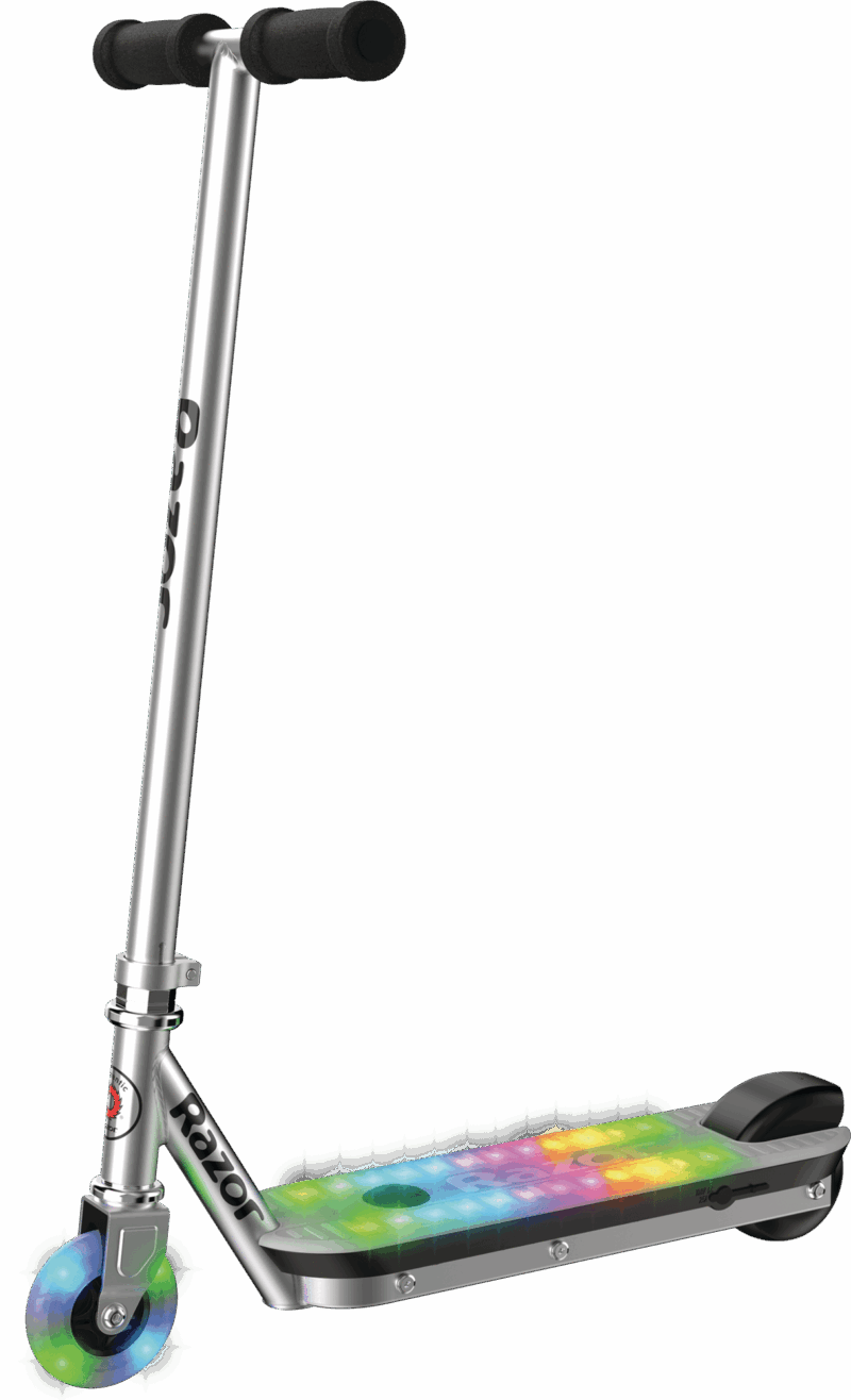 Get ready to glow on a magic carpet ride with the Color Rave electric scooter that glides along at your command! Just step aboard and kick off, with motorized speeds of up to 7.5 mph (12 km/h). You get up to 30 minutes of continuous ride-time on a single battery charge. The eye-catching 3 mode, multi-color light show on the scooter’s deck and front wheel ensure no one will miss you as you ride along on your adventures! Need to stop? Your wish is its command: simply step on the rear fender brake to slow down. With a scooter weight of 8.71 lbs (3.95 kg) and a maximum rider weight of 110 lbs (50 kg), this is recommended for child ages 6 and up. With all these great features and more, Color Rave electric scooter is another top-quality ride from Razor, the world’s leader in wheeled goods performance and innovation. (Product Net Content: 1 unit)