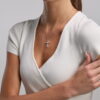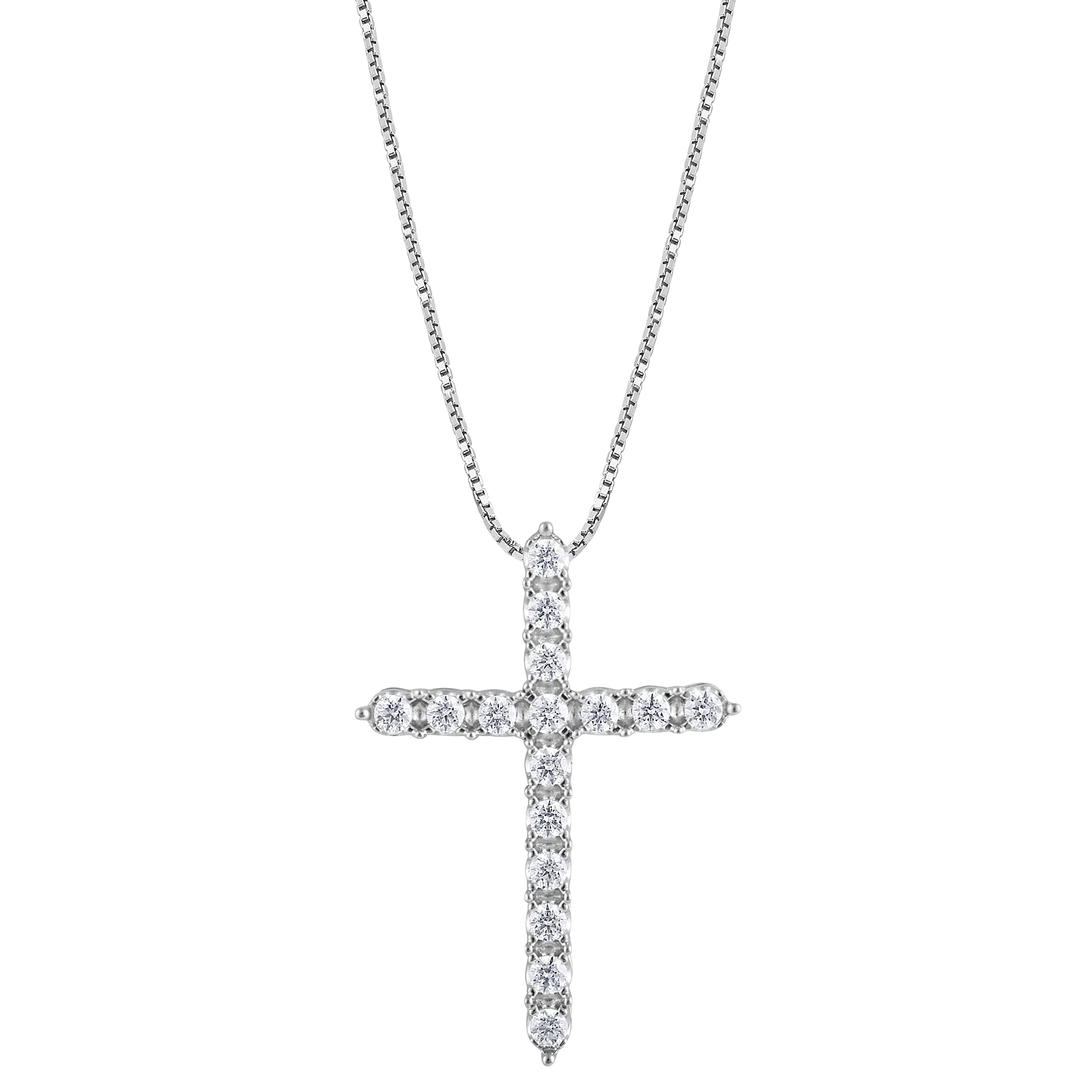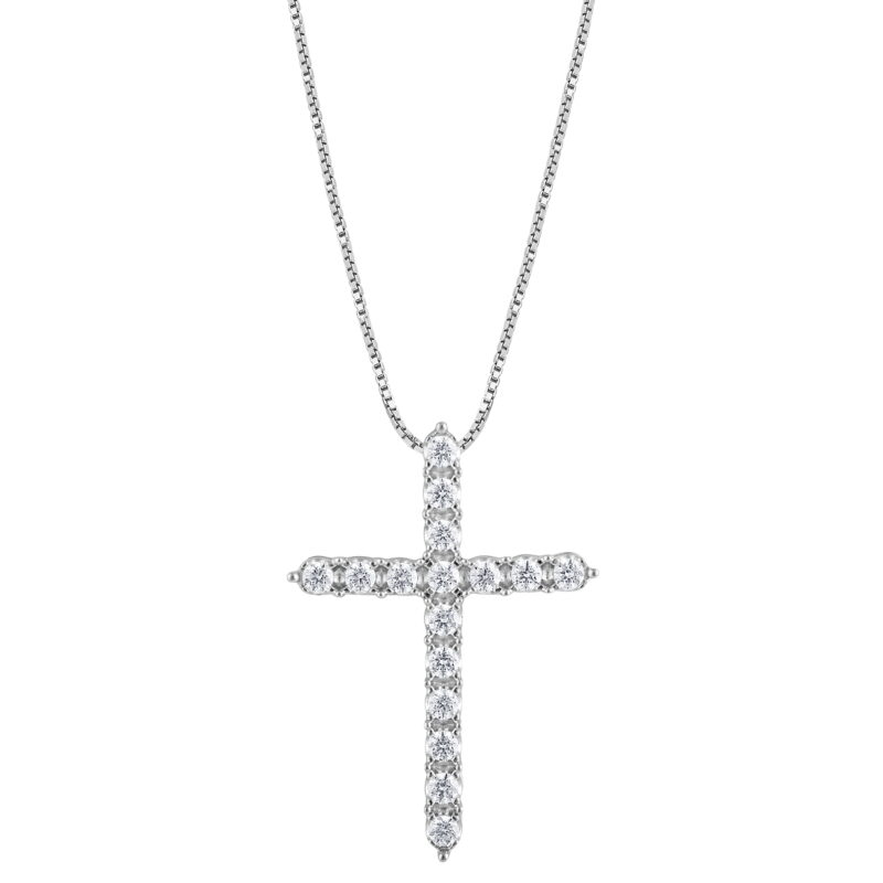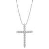 Unique Moments 1/2 ct Round Lab Grown Diamond Cross Pendant in Sterling Silver (J, SI-I1). Shimmering with graceful design, this diamond cross pendant is a look she’ll wear with everything. Created in Sterling Silver, this elegant style showcases sparkling diamonds set along a cascade of sculpted ribbons. Captivating with 1/2 cttw. of lab grown diamonds and a brilliant buffed luster, this pendant suspends along an 18.0-inch box chain that secures with a spring-ring clasp.