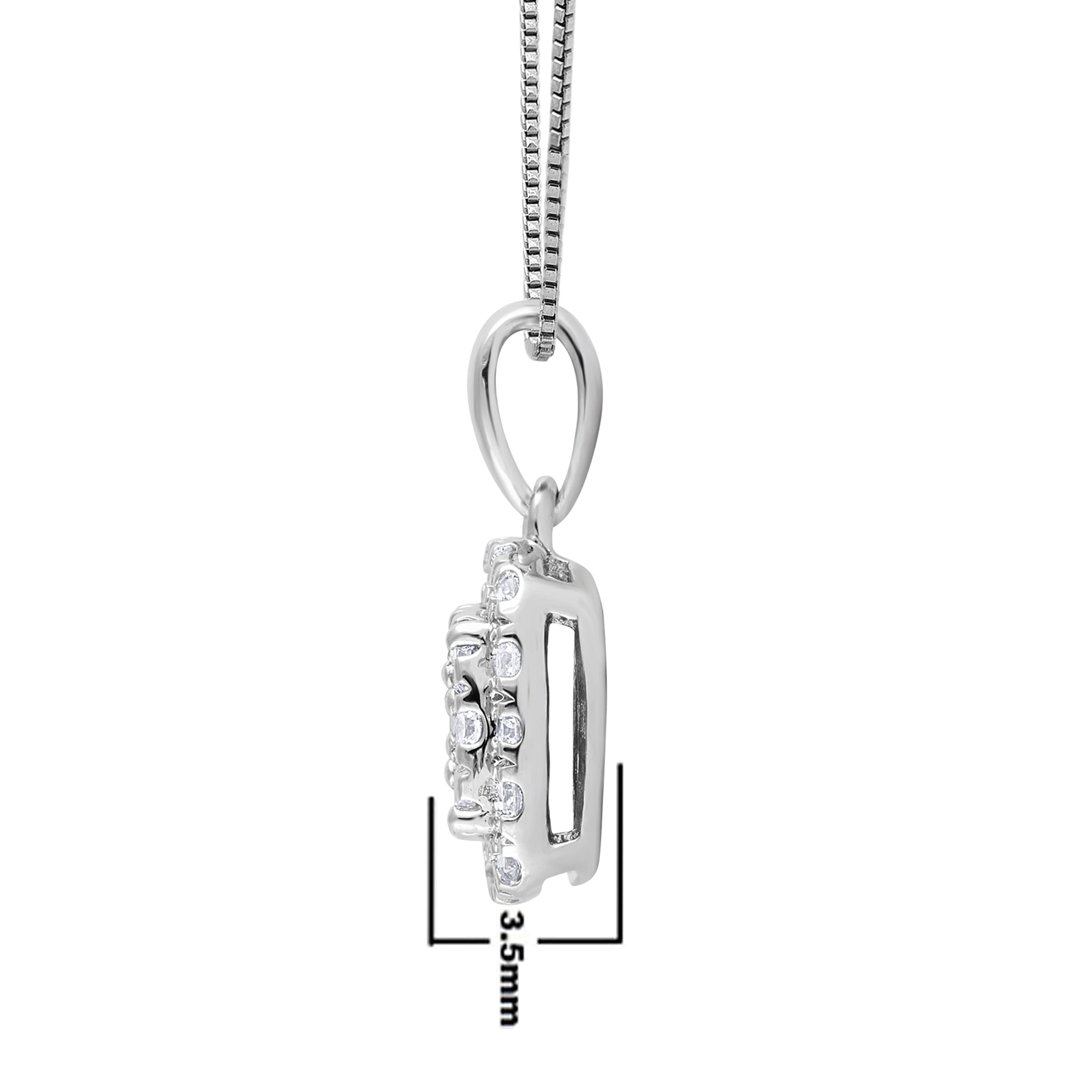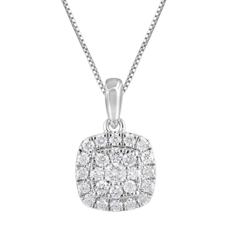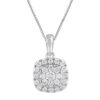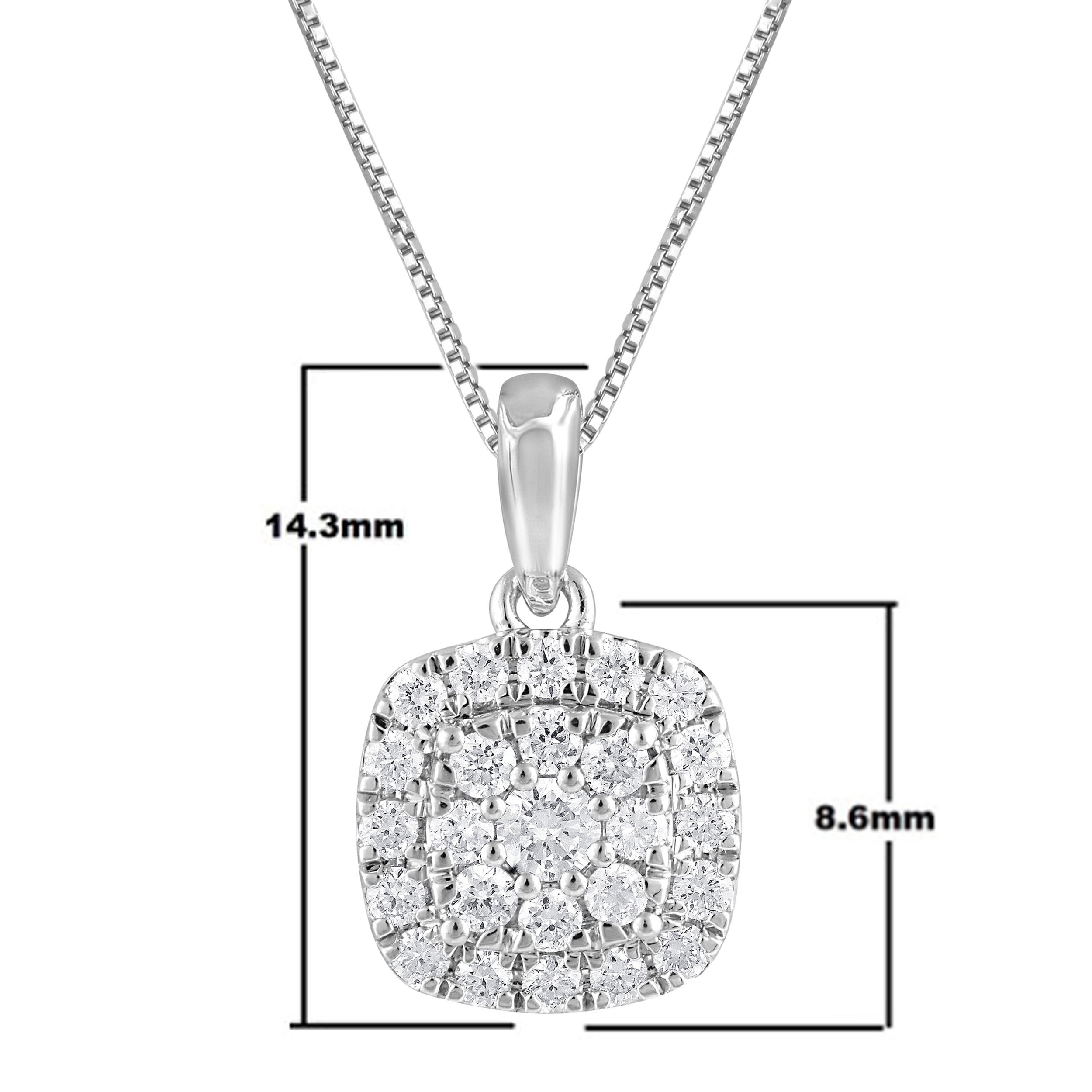 She’ll admire the beauty of the clever diamond pendant. Created in sterling silver, this look features a cushion-shaped composite of diamonds wrapped in a cushion-shaped frame of round diamonds. All round diamonds are artfully set to enhance size and sparkle. Radiant with 1/3 ct. t.w. of diamonds and a brilliant buffed luster, this pendant suspends along an 18.0-inch Box chain that secures with a lobster clasp.