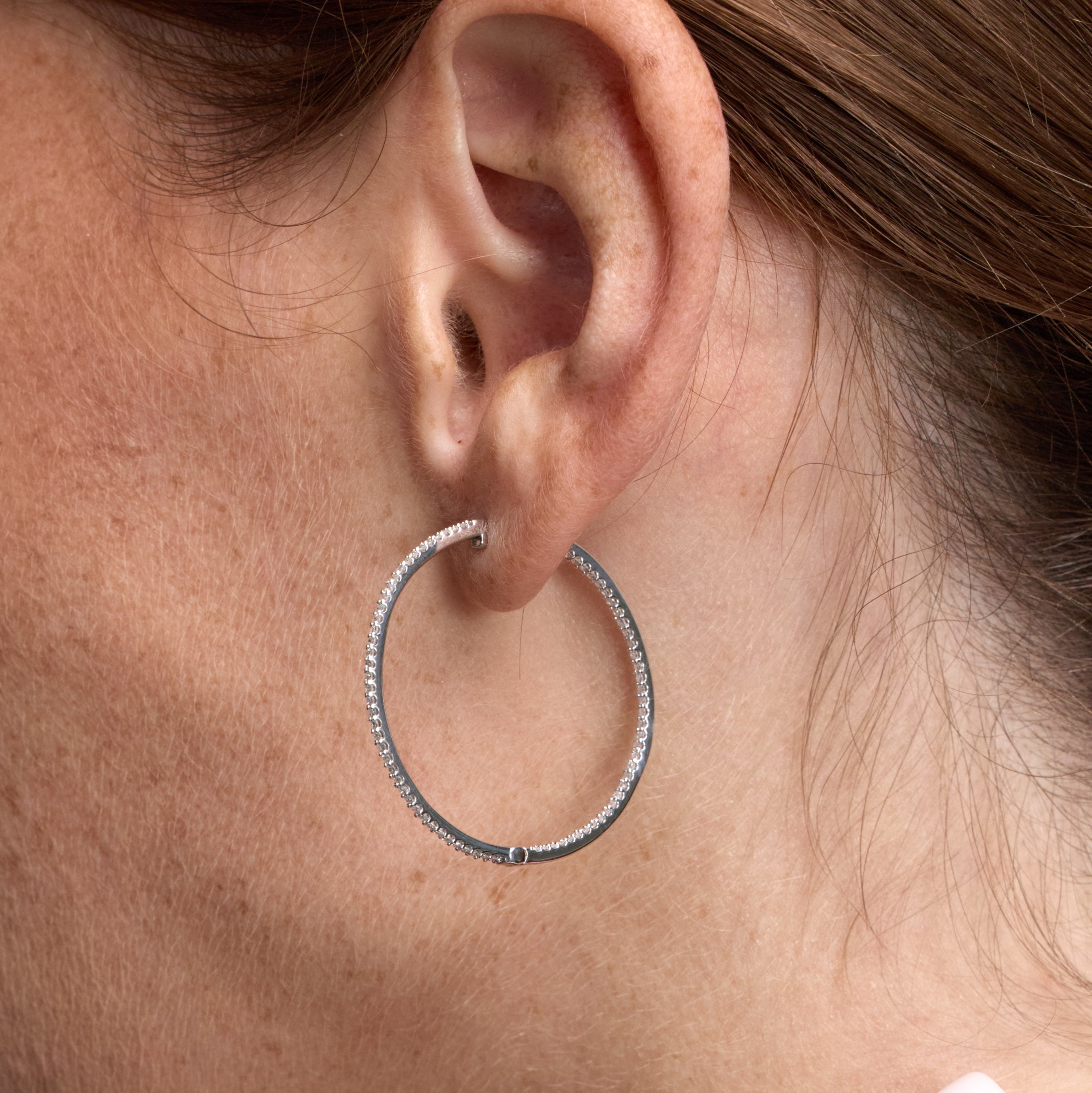 Indulge in the sheer brilliance of our Unique Moments 0.75 ct Round Lab Grown Diamond Inside Out Hoop Earrings. Meticulously crafted in Sterling Silver (H-I, SI-I1) with a prong set design, these earrings epitomize luxury and class. The round lab-grown diamonds shimmer effortlessly, creating a mesmerizing sparkle with every movement. Enhance your personal style with these stunning hoops for a truly unique and captivating look.