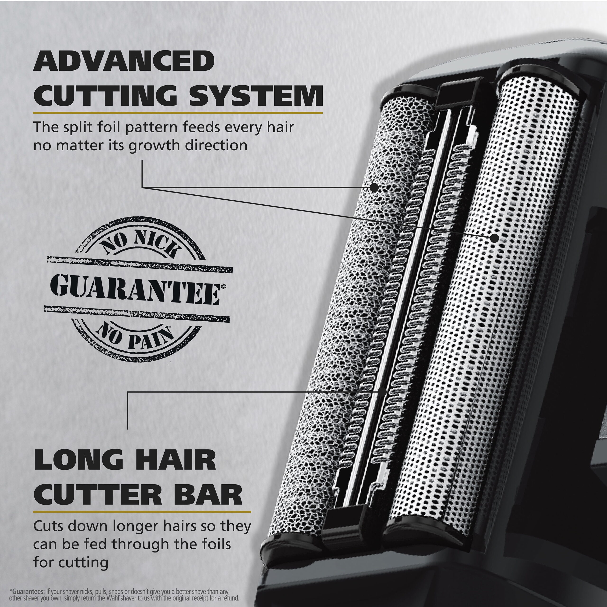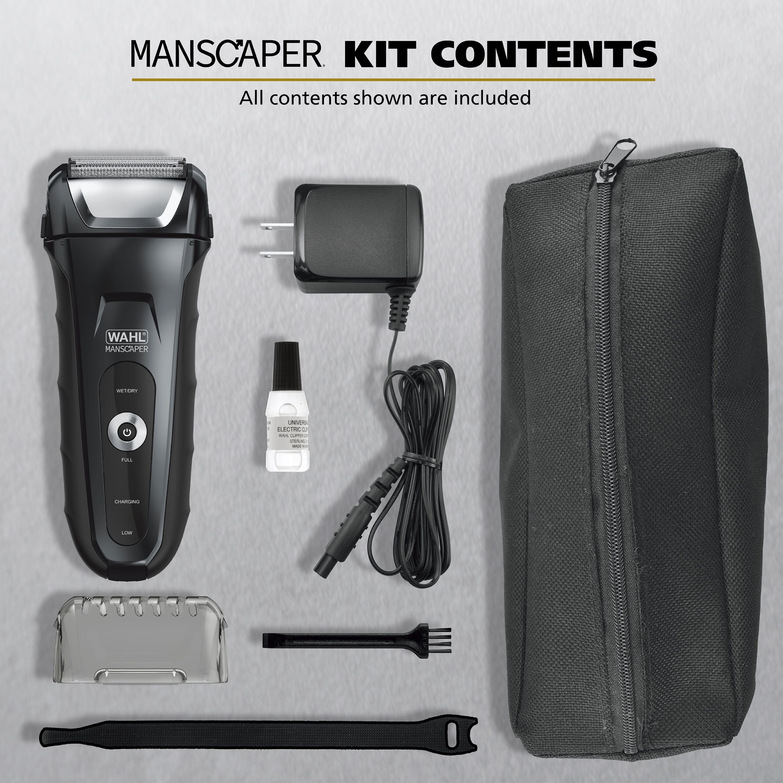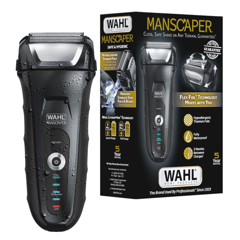 Wahl Manscaper Lithium-Ion Hypoallergenic Shaver with Flexible Titanium Foils to Prevent Skin Irritation and Shaver Bumps. This Manscaper Shaver features a 90-minute run time from a 1 hour charge as well as quick charging with 5 minutes of run time from 5 minutes of charging; The battery and can go up to one year between charges with no ‘memory’ issues. This travel-friendly rechargeable wet/dry electric shaver is showerproof and features flexible foil cutters & a pivoting head for a comfortable shave, a non-slip grip & travel lock, & Battery Fuel Gauge. Flexible foils move with you, providing a more comfortable shave, our advanced foil pattern provides smooth shaves & features a long hair cutter bar as well as a full-size pop-up precision trimmer. Wahl clippers, trimmers, & shavers are available in a variety of styles to meet your home hair cutting needs. From Lithium Ion cordless & rechargeable clippers to heavy-duty corded models. Pick up this shaver today, for the male in your life.