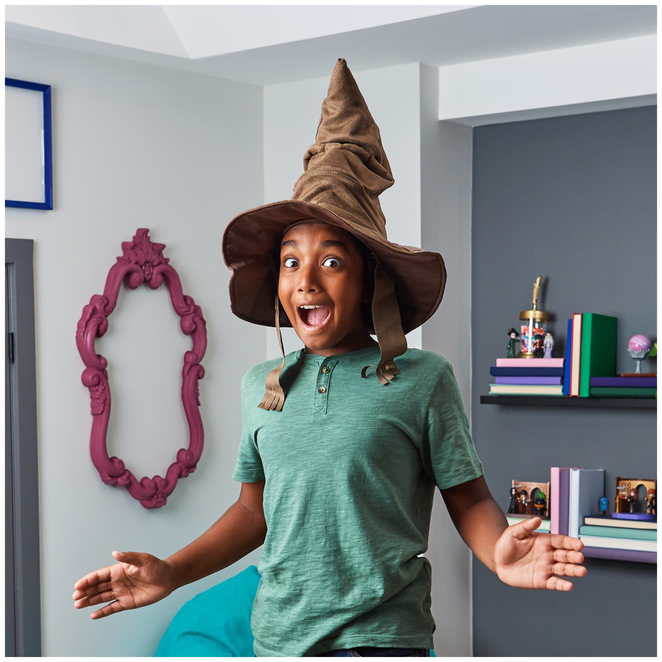 Find out your Hogwarts House with the talking Wizarding World Sorting Hat. With 15 phrases, authentic details and full facial movements, the Sorting Hat is a spellbinding way for young witches, wizards, and Muggles to recreate the iconic first-year Sorting Ceremony scene from Harry Potter. Place the hat on your head and the Sorting Hat will automatically respond. Its eyebrows, head and mouth will move as it determines and announces the Hogwarts House for the wearer. Will it pick Gryffindor, Ravenclaw, Hufflepuff or Slytherin? Press the button on the brim of the Sorting Hat to hear more phrases. This enchanting Sorting Hat is a must-have gift for kids ages 5 and up. 3 AA batteries included. The Sorting Hat Speaks English and French – simply slide the switch to choose your preferred language.